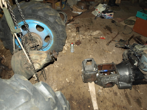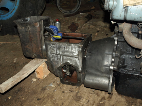 Paar pilti ka siis selgituseks. Mootor asub pildil käigukasti suhtes muidugi liiga madalal- need ei ole omavahel kinni keeratud, lihtsalt lahtiselt laotud. Multicari silla ots hoiab iseenesest ülespidi ja seega ülespoole ulatuv reduktor on nagu loodud sinna. Reduktor muudab ka pöörlemissuuna vastupidiseks- nii nagu Multicari sild nõuabki. Kui asi paika tõsta, siis jääb käigukasti alt kliirens 32 cm ja silla alt 31 cm.