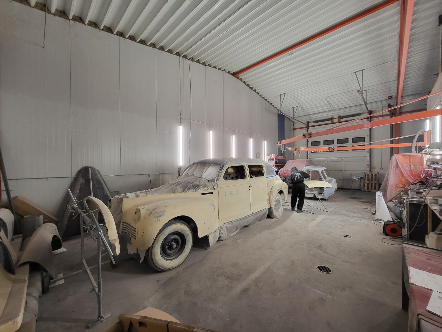 3. ZIS 110, värvimise ettevalmistamisel. Kuna Eestimaalt värvitöödeks sobilikku kohta ja meest ei leidnud, tegin taotluse PPA-le ja sain loa tuua Ukrainast töömees, kellele maksan Eesti keskmist palka + kõik maksud ja annan ka elamise. See mees on jube hea käega ja on Ukrainas kõik meie autod pahteldanud ja värvinud. Momendil jääb see töö pooleli ja mees sõidab pühadeks koju. Vaja on Ukrainas ära pahteldada ja värvida Pobi mootoriga Volga. Kui see saab tehtud, tuleb tagasi ja lõpetab ära ZIS-si ja pahteldab ja värvib ära ka M1V8. Kogu ZIS-si kroom sai viidud Narva ja loodan, et alates Mai kuust saab hakata ZIS-si kokku panema. Loodan, et 2023 kevadeks saab see auto valmis.