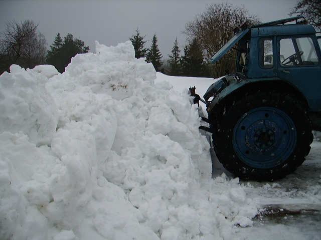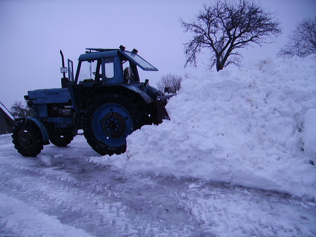 Minul on lumetõrjeks hübriidruss põiktera ja tagakopaga. Väga ei kurda, aga sulalund tuleb tükkhaaval ära tõsta, sest kolmetonnine traktor kettideta ei tee raskele lumevallile midagi.
