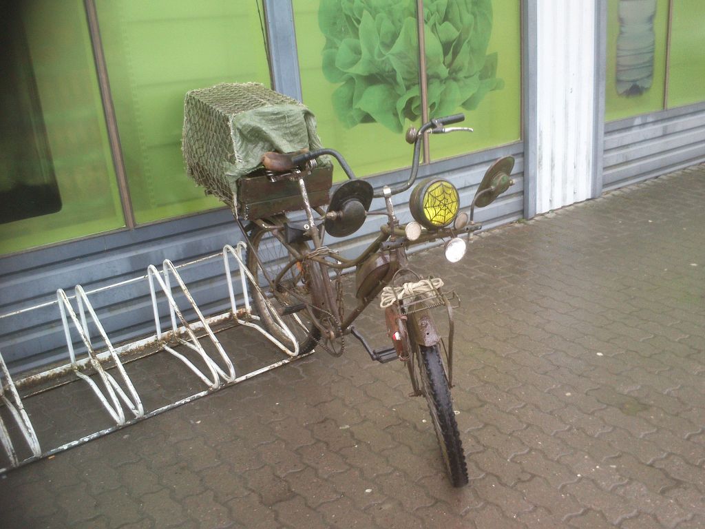 Olen näinud sama või taolist ratast samas Saastamarkeedi parklas tunduvalt kõvemas seades. Rekka tahavaatepeeglid olid ntx kõrgele tõstetud ja laiali viidud, nagu veaks haagissuvilat. Nüüd on seda "ikebanat" kõvasti koomale tõmmatud. Ei tea kas peegel jäi posti taha kinni ja käis maoli... Aga ikkagi väga kõva!