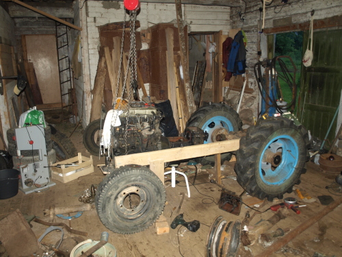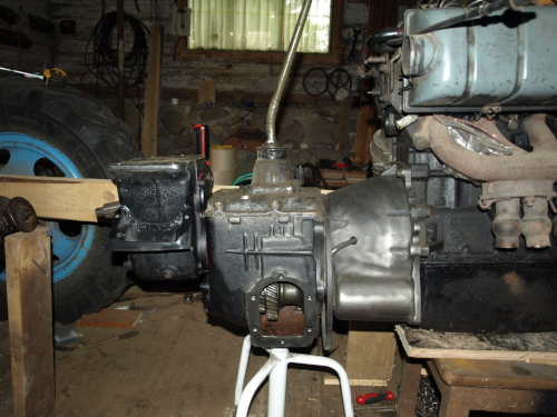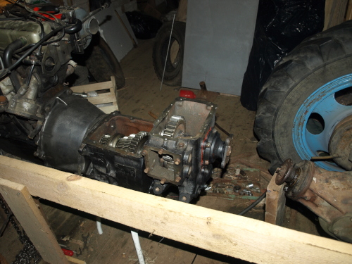 Pildil siis Fordi 1.6 diisel, siis gaz53 käimakast ja selle otsas veel gaz66- e vahekastist tehtud reduktor, millel sai kolmandik maha lõigatud ja ainult aeglustiosa sisse jäätud. Selleks tuli aga kaks võlli pooleks lõigata ja ühe algus ja teise lõpp kokku panna. Sidur sai loomulikult ümber tehtud ja see tundub, et töötab ka hästi. Kokkupanek läks suht lihtsalt, sest sidurokorvi käigukastipoolne ava istus peaaegu täpselt survelaagri juhtpinna flantsile- no natuke sai hoonitud, et otsa läheks ja reduktori ja käigukasti laagrid on ka samad, seega sai sinna vahetükk tehtud, mis käigukasti poolt istub laagri otsas ja teiseltpoolt läheb reduktori laagriavasse- peaks üsna täpne värk olema