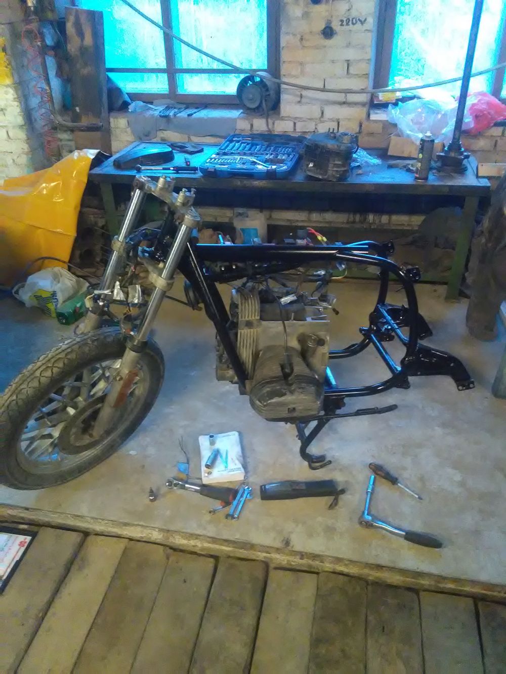 Progress siis sealmaal, et tehnika on peal ja rattad all. Lükkasin ka õlid sisse mootorisse, käigukasti. Nüüd vaja veel ära ühendada suunatuled ja esituli. Siis mõistatada veel, et kust vanasti jooksis tühikäigu indikaatortule juhtmestik, anduril on 2 juhet, mul üle vaid 1 juhe. Võib-olla käiski ühega, ei tea.
