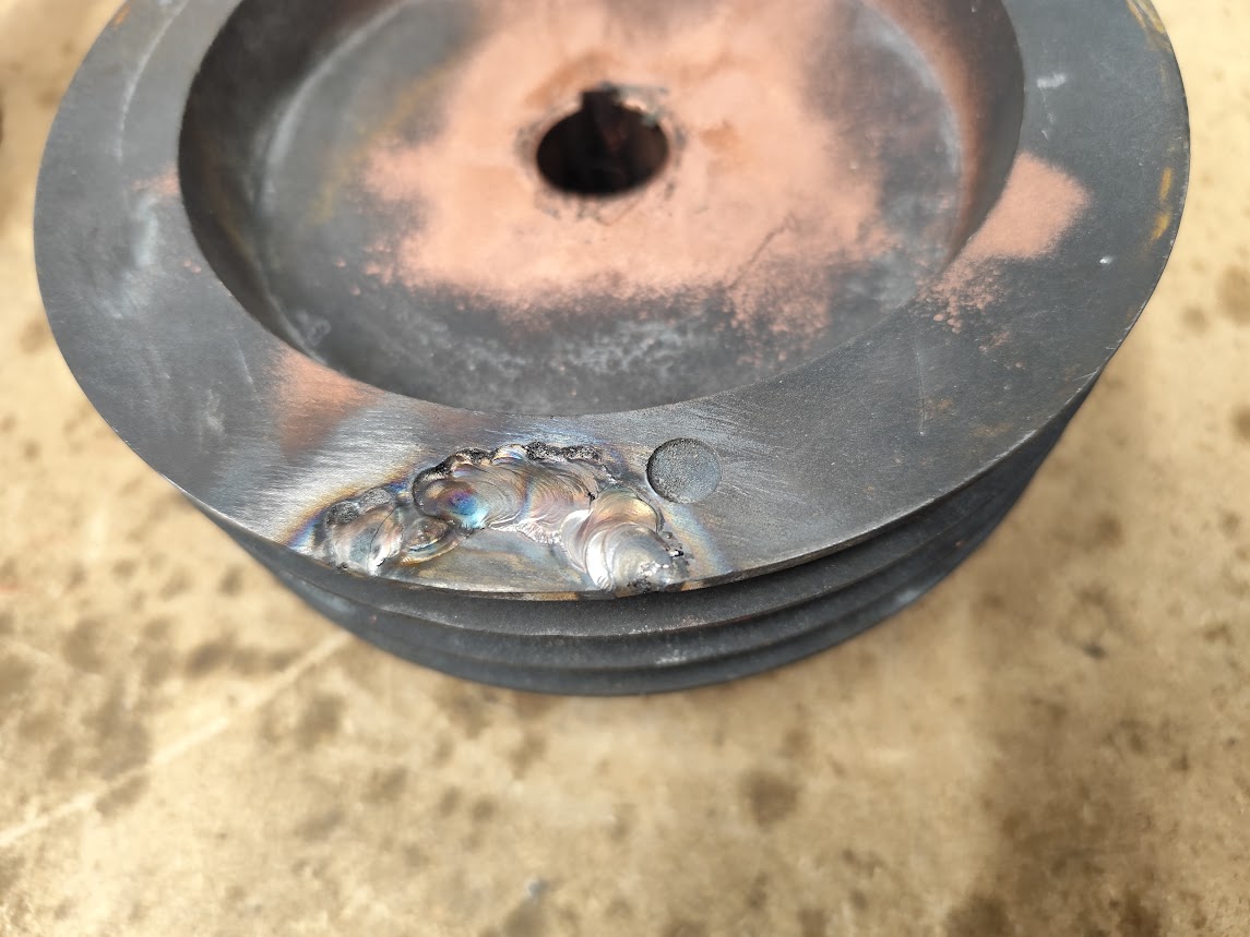Otseselt keevitamine (tule tegemine) ise on suht väike asi. Jääb mulje, et tükk ei asetu ebapiisava eeltöö tõttu täpselt kohale ning seega rihmale tuge ikkagi ei anna. Teiseks kas puuduliku soojusrežiimi või vale täitematerjali tõttu on keevis praod sisse võtnud. Tõenäoliselt tükk minema küll ei lenda, aga originaalis oli tasakaalustamiseks just tüki kohalt metalli välja puuritud. Nüüd on sinna samasse materjali juurde sulatatud. Küsimus pole kas vaid kui palju vibrama hakkab?