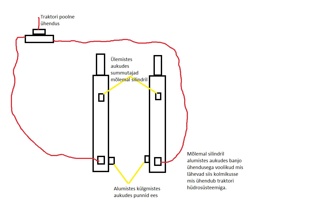 Ma ühendasin nii, et mõlemale silindrile alumisest august banjo stuts ja sealt mõlemad otsad said kokku kolmikus, mille kolmas ots oli siis traktori hüdro. Nagu pildil on näha siis on all külje peal ka kollane kork, neid ma pole näppinud. Ülemistesse aukudess keerasin summutajad sisse.