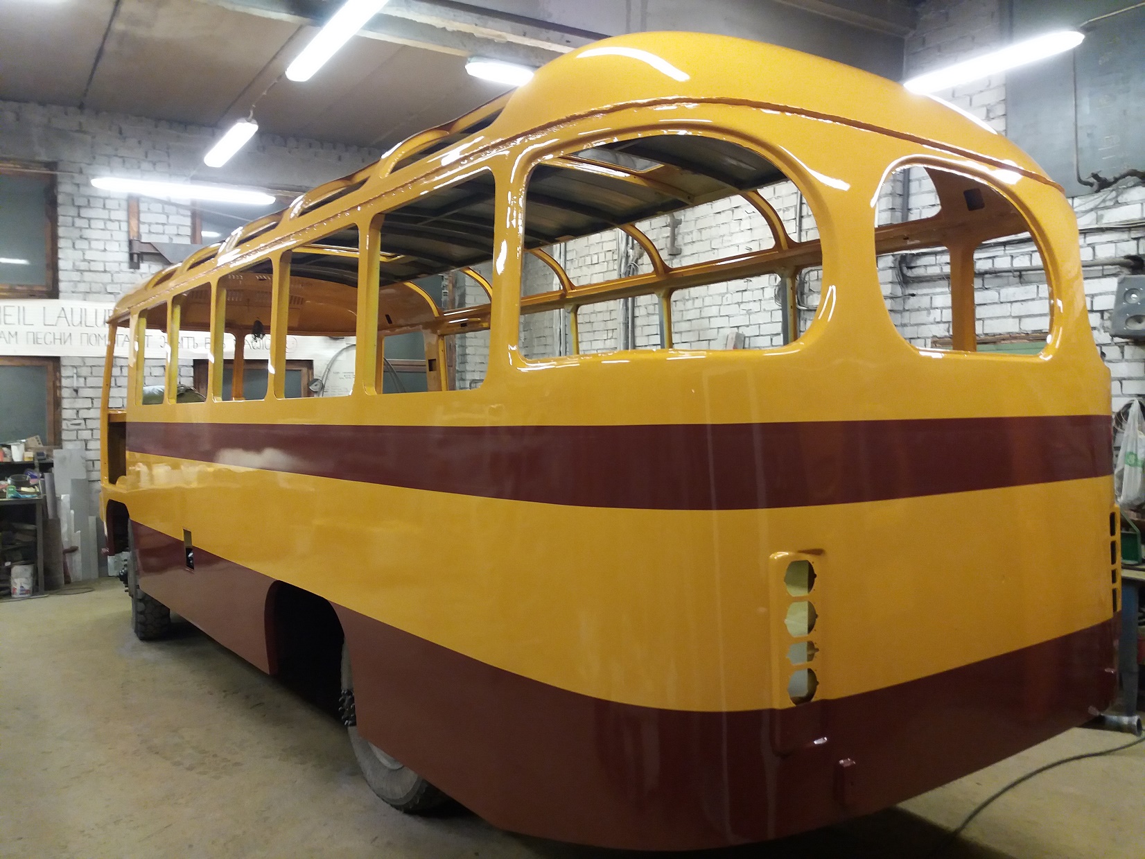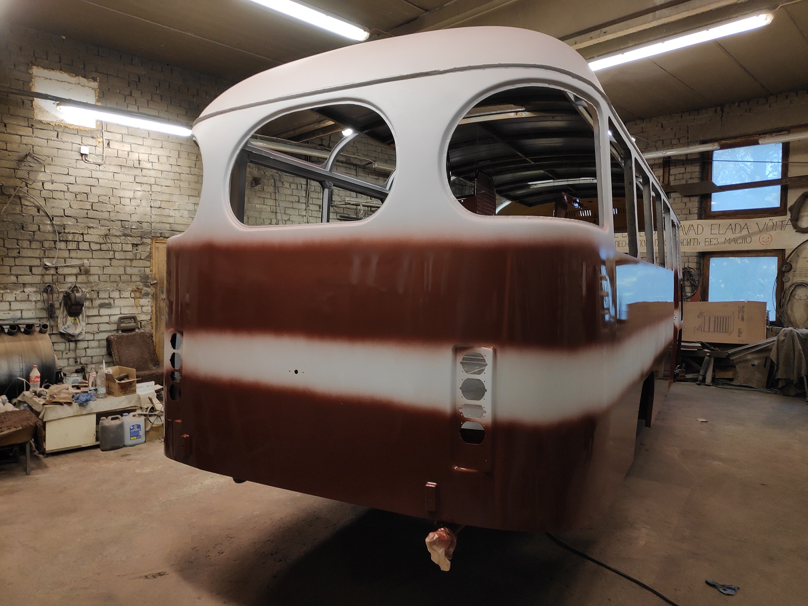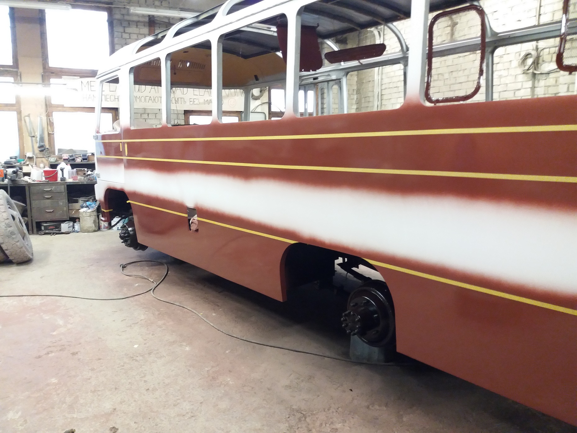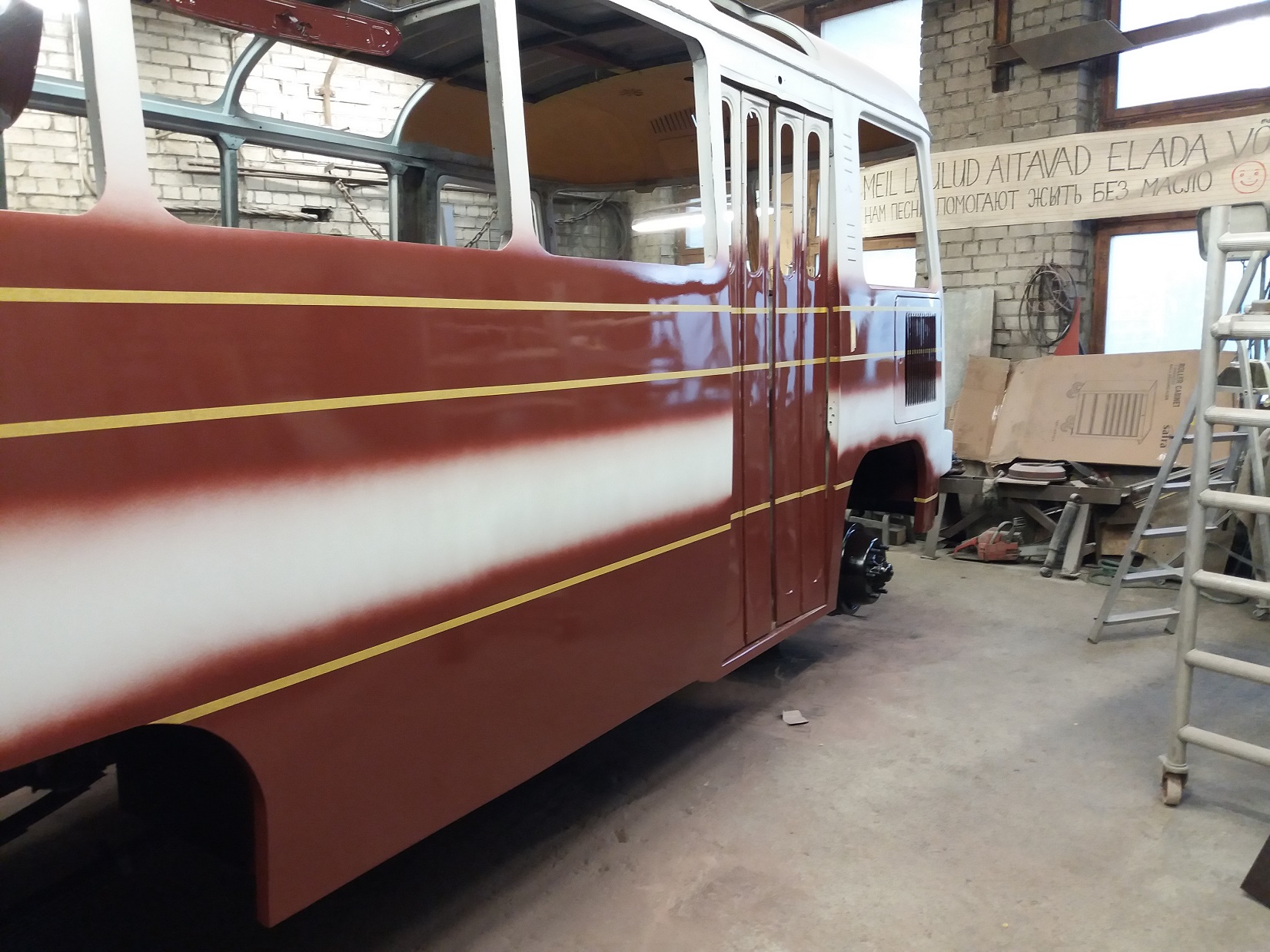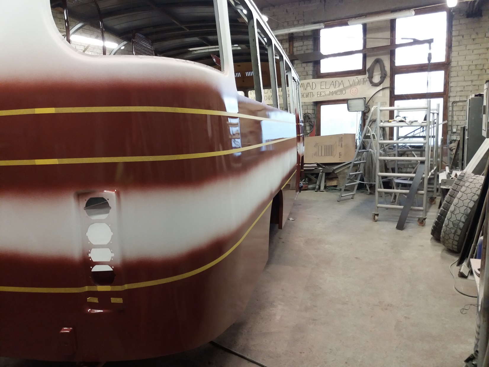 Bussi pahteldustööd on jõudnud lõpule ja peale on saanud krunt ning triipude värv.