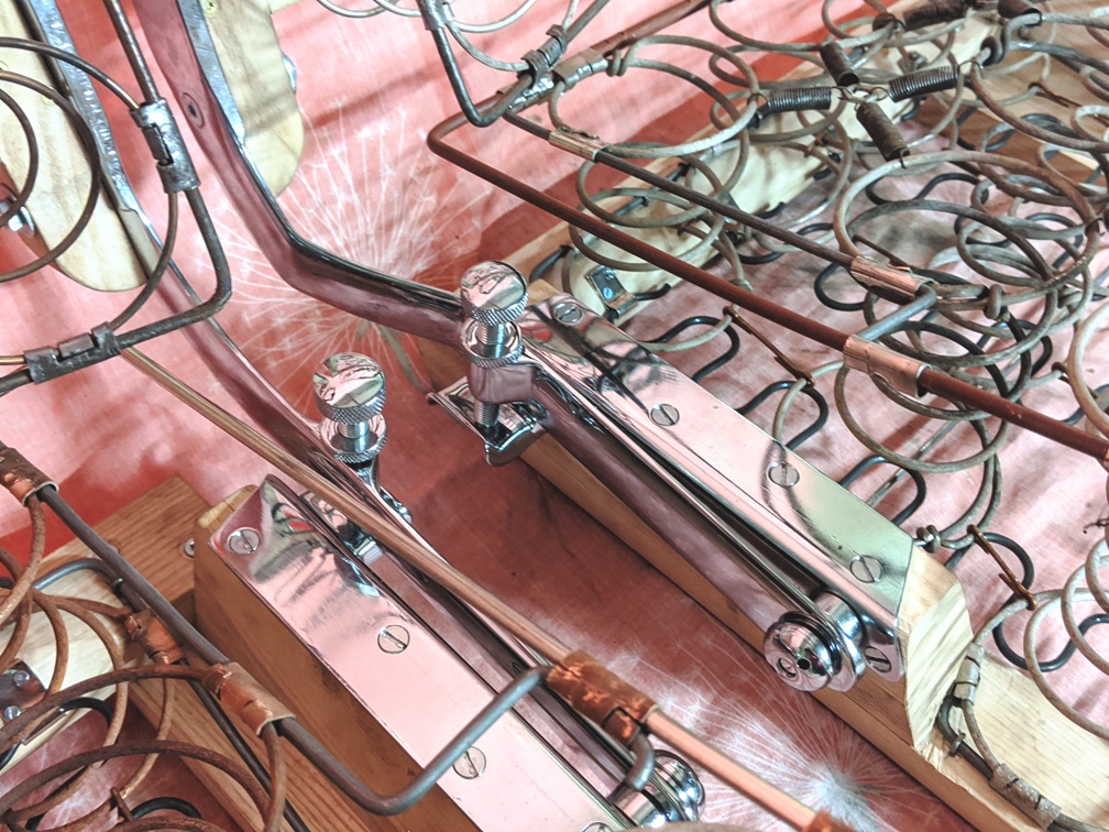Siit on näha, kui palju oli võimalik säilitada vana plekki. Hingede tegemine on omaette töö, kuna olemas on vaid üks originaalhinge ülemine pool. Praegu on kasutusel isevalmistatud hinged, et kuju geomeetriat paika ajada.