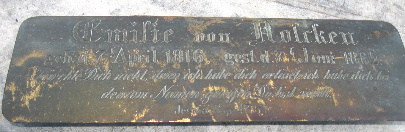 kust see Emilie von Nolckeni sünni- ja surmadaatumiga tahvel pärineb? Mis ta mõõdud on. Ilmselgelt on see mingi kirstu, hauakambri, risti vms pealt pärit
