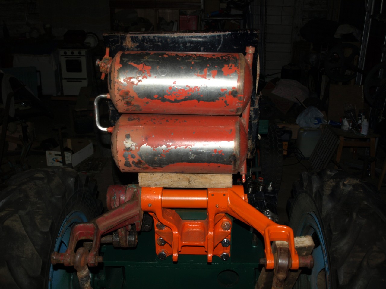 Õnnestus saada ka üks imelik kahest balloonist koosnev süsteem, mis peaks olema tuletõrjuja hapnikuballoon millega suitsu sisse minnakse. Teen sellest- ühest õli-, ja teisest naftapaagi. Vahetorud lõikan lahti, keevitan augu kinni ja siis uuesti kokku. Mõnele saab selline näiliselt ühendatud nafta ja hüdropaagi kompunn peavaluks