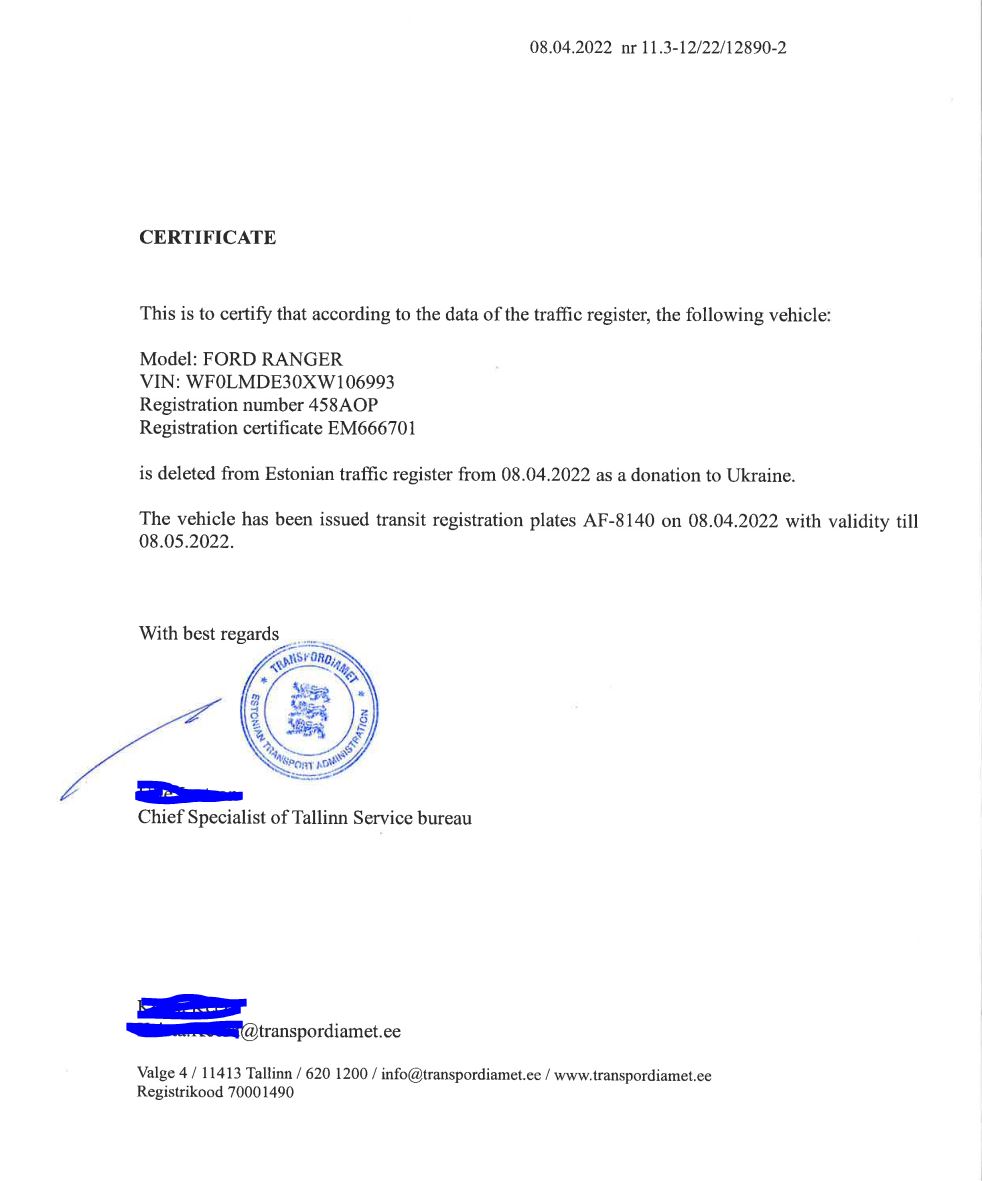 On jäänud ainult arvelt mahavõtmine ja transiitnumbrite vormistamine, millega praegu tegeleb ksf. Nastik ning esmaspäeva hommikul läheb auto treileriga Ukraina suunas. Poola piirile tulevad sõjaväelased vastu ja sõidavad ise sinna, kuhu vaja.