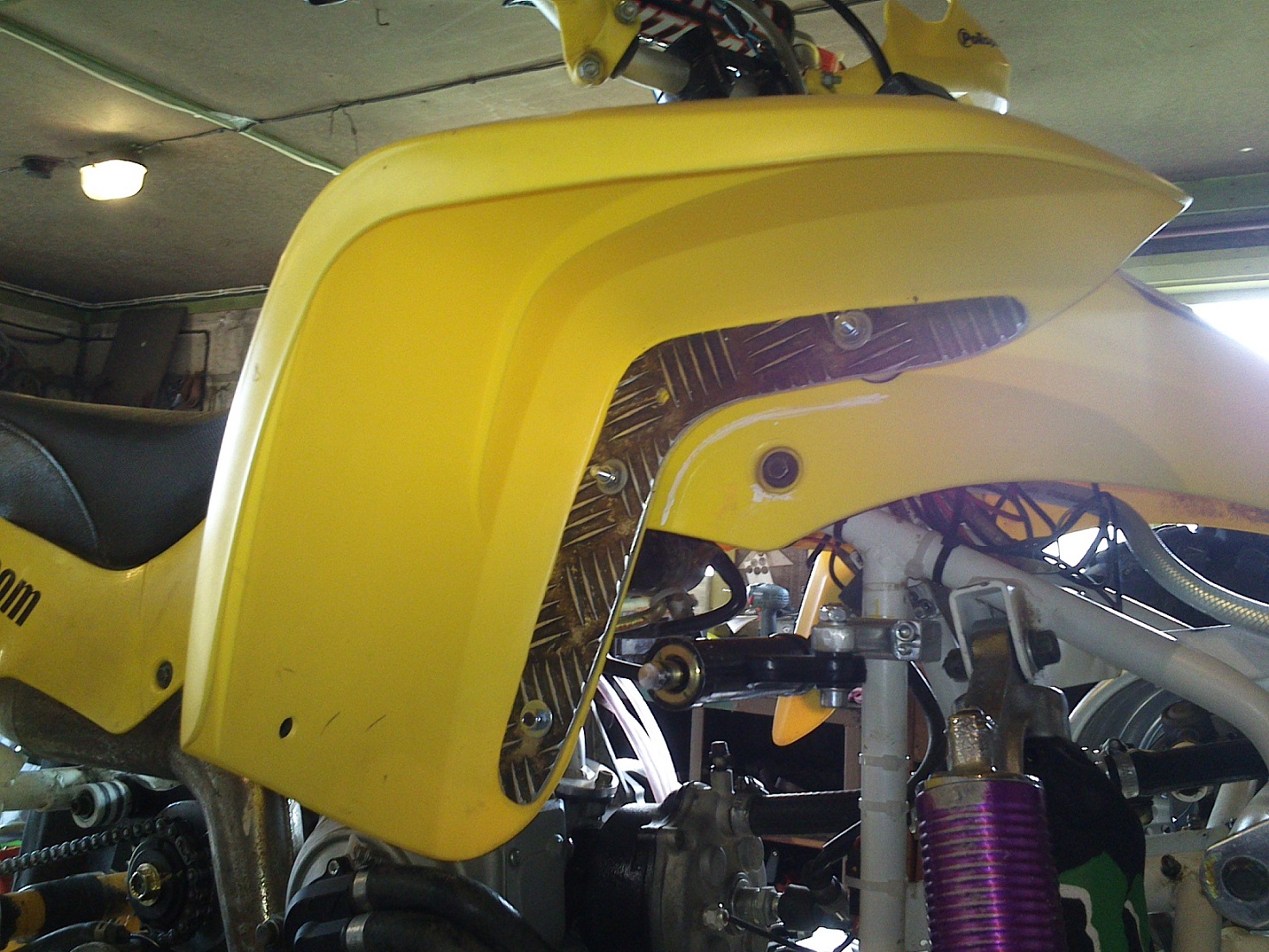 Originaal oli 4mm paksust raudplaadist ja raske. See aga sai ju ää löigatud. Uue tegin 4mm paksust duralumiiniumist. Oluliselt kergem. Vöimalik ka, et ei pea löögile nii hästi vastu kui rauast, kuid sinna kivi pihtasaamise töenäosus on üliväike (siiani pole veel sinna pauku saanud) ja enamuse paugud vötab enda peale rummualune plaat, siis saab ketiratta kaitse rohkem "igaksjuhuks" seal olema. Ja ühe kaitsepaugu peab ka duralu vastu.