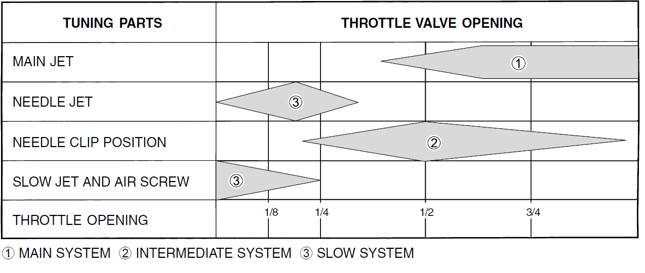 Ja siis üks pisike tabel selgitamaks karburaatori osade tööpiirkondi, kui seadistada.