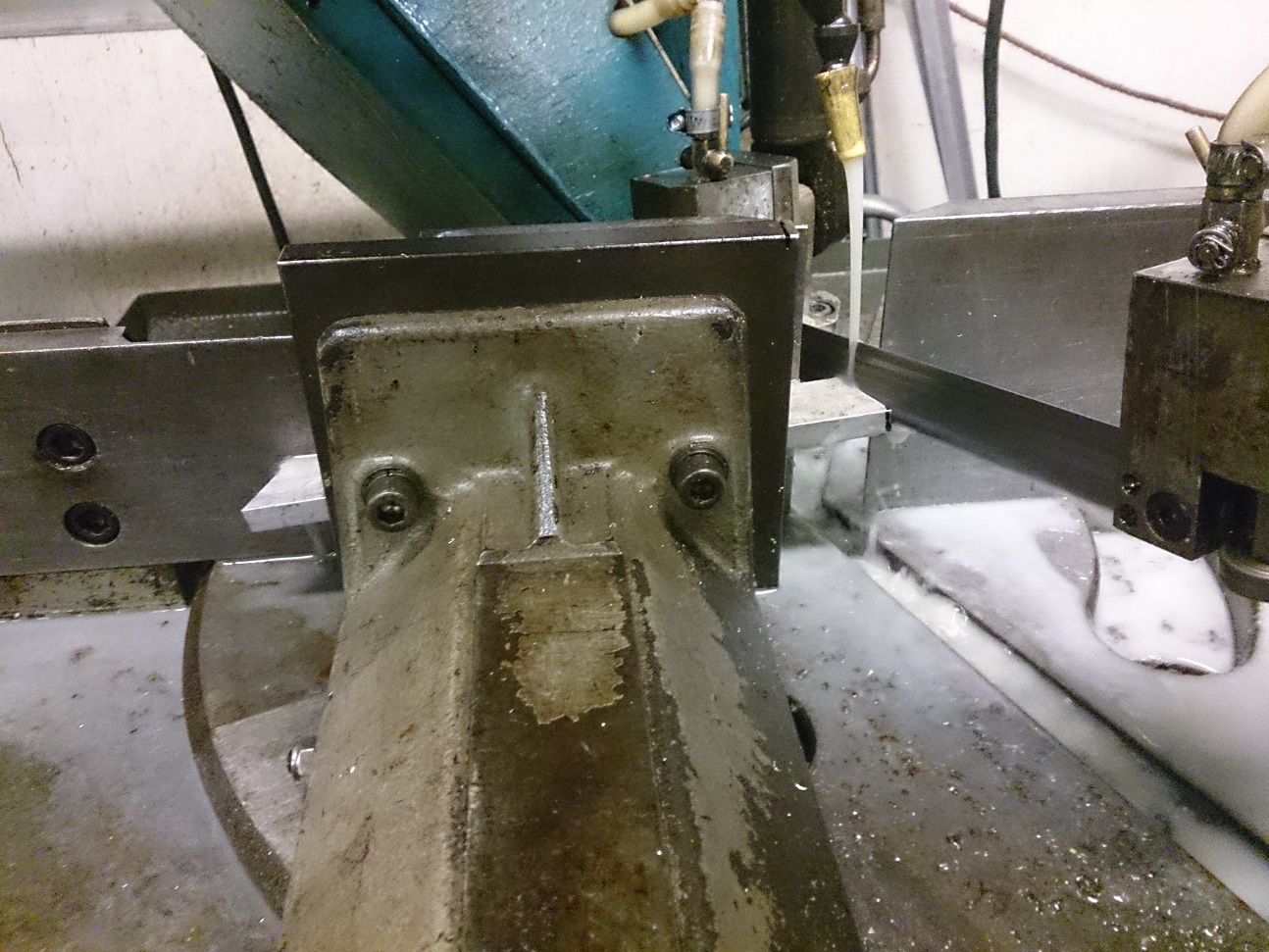 Kuna kolmnurga jalad on on omavahel kahe telje suhtes nurga all, siis mugavamaks keevituseks otsustasin tugevdus-jupi otsad ka nii täpselt saagida, et nad täispinnaga vasta jalga puutuksid. Saepingis sai lindi nurka ühtepidi küll keerata 22 kraadi, kuid teise nurga saamiseks 6 kraadi pidin hoopis toorikut käpa vahel nurga-alla paigutama: