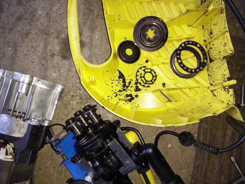 Käib ikka õli sisse. Kui keerad need 4 polti lahti,mis hoiavad plastikust pumba osa, kus on sissetulev vesi ja väljaminev vesi, siis seal taga on planetaarülekanne plunseritele. See ülekanne peab olema õli sees ja tihendatakse kummist rõngastihendiga Kui mootori pöörded langevad ja mootorist tuleb kärsakat ja harjad kollektoril pilluvad TUGEVAID sädemeid, siis on mootori ankruga kukupiilu (lühiskeerud)