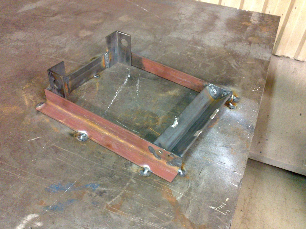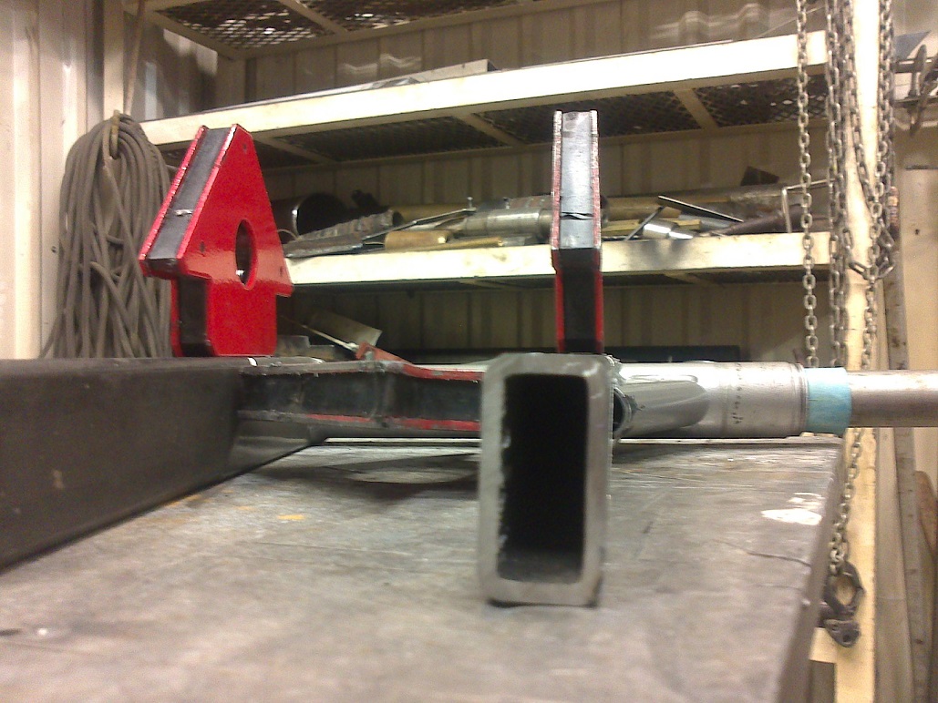 Et nüüd tagaosas rummukinnitust paika saada, aretan kiigele rakise, kus siis saab rummukorpuse otseks rihitud kinnitusvölliga. Siis töötlen keevituskohad vastavalt rihtimisele ning fikseerin rakise ja keevitus vöib taas alata. Rakis tuleb miskit sellist, et esiosa on kinni ning tagaosa toetub lihtsalt omaraskusega süvendisse, siis saab keevituse ajal jälgida, et ta kiskuma ei hakkaks. Muidu kui mölemad pooled jäigalt kinni panna ja siis kokku keevitada, siis lahtivöttes vöib tulla üllatus, et keevitus jäi pingesse ning kiige jääb keere.
