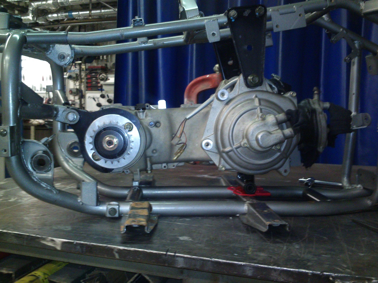 Mootor praktselt vaid rippus raami kinnituste küljes, seega hüpetel raskusega kiskus end alla. Tehas muutis seda, lisades ka mootori alla kinnituse, millele viimane toetuda saab. Nii on mootoril kinnitus vastas kui ta allapoole vajuda tahab ja raam muutub ka läbi mootori natukse jäigemaks. Lisasin alumise kinnituse kuid puudusid mo raamil körvad selle jaoks, need tuli ise löigata ja keevitada: