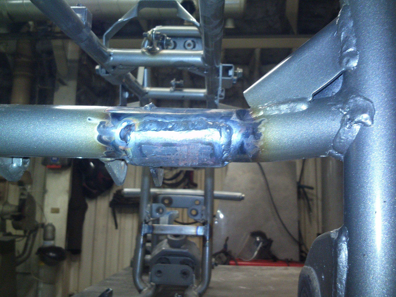 Mk1 raamil puudus keti rullik esimese ketihammaka kohal, seega kui kett tagasillalt mootoripoole liikus, käis ta vasta raami ristitoru ning söi sinna sooned sisse. Kui masina sain, siis kohe ka panin sinna rulliku, kuid sooned olid juba sees. Ning söiduga tekitas iga soone nurgast torusse prao. Keevitasin praod kinni, panin paiga peale: