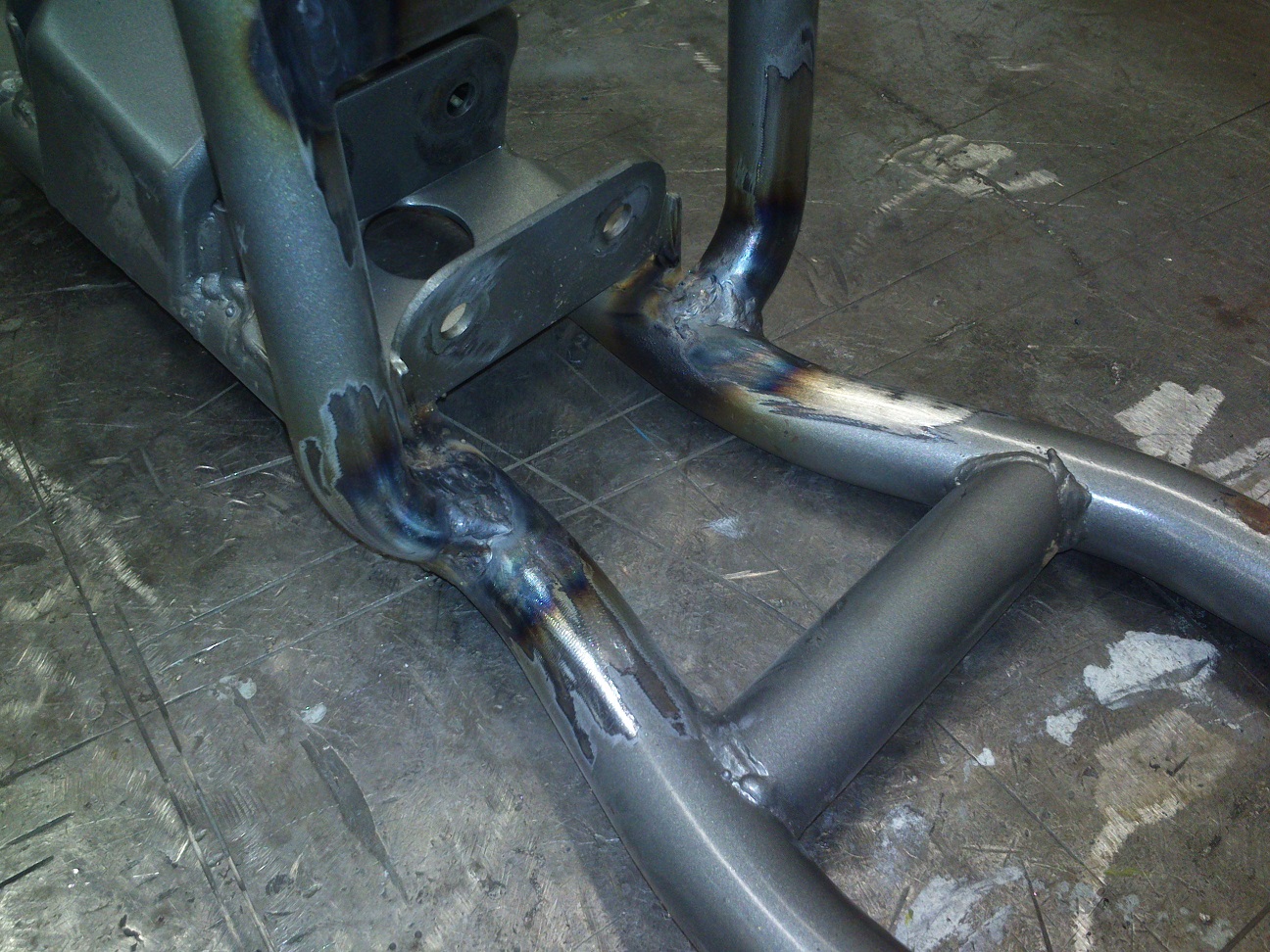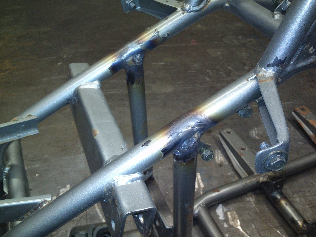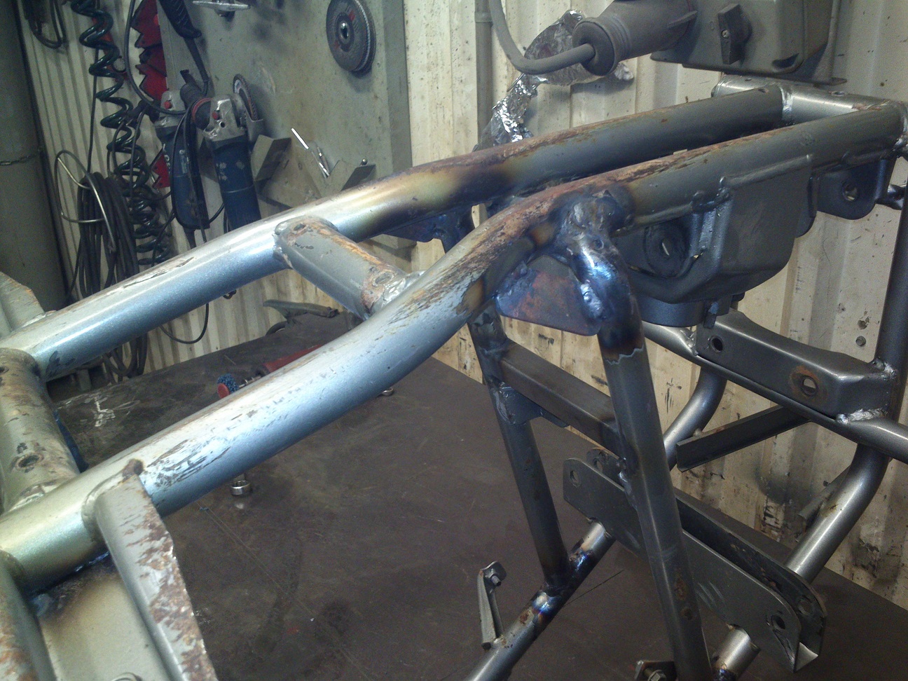 Nagu ennist kirjutasin, siis mootor vaid rippus raami küljes. Selle töttu olid tekkinud mölemale ülemisele raamitorule just kinnituskohtade juurde praod ... natuke veel ja see oleks pooleks läinud, sest toru pinnast jooksis pragu pea 90% ringile: