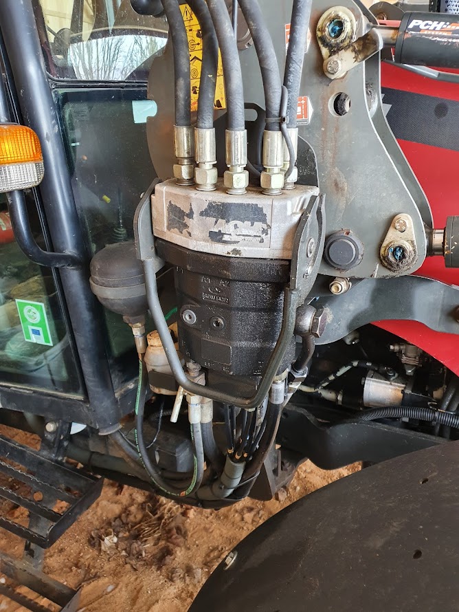 Laaduri juhtimiseks tundub jah selline tavaline trossidega rõõmupulk. Pole veel väga süvenenud kuidas see täpselt töötab selles mõttes, et kust see jagaja omale hüdro peale saab. Aga kahtlustan, et küllap üsna standard lahendusega tegu ning juba tehases vastavad väljavõtted hüdrosüsteemi lisatud. Üks voolik tundus natuke õli läbi immitsevat. Nii et ehk natuke peab tulevikus uurima, kuidas see asi töötab.