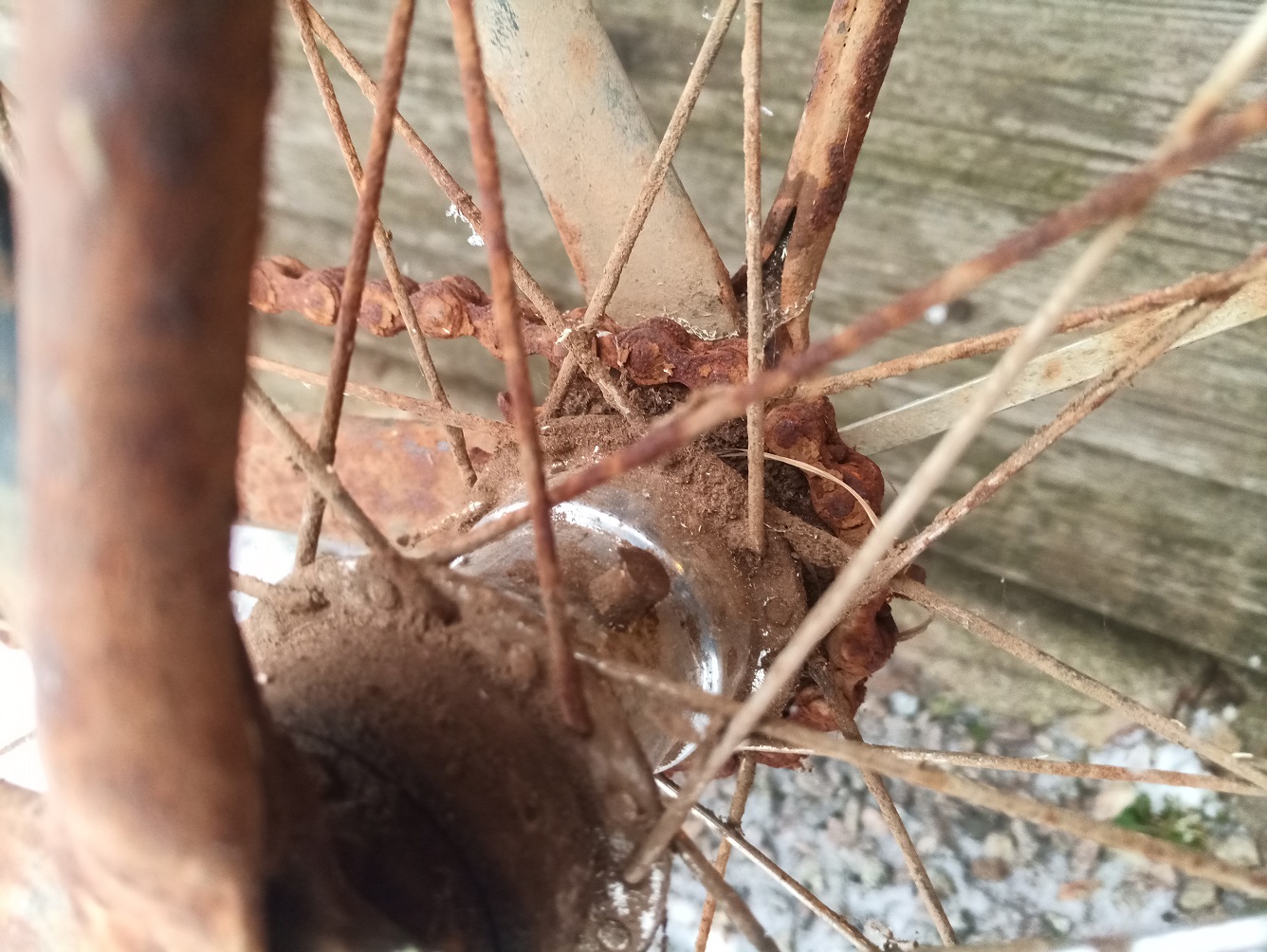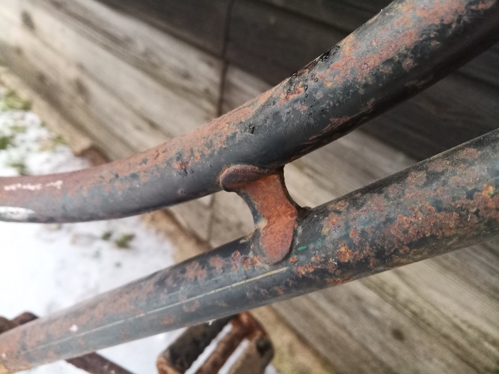 Õrnapõrnalistele foorumiliikmetele rahustuseks olgu kohe öeldud, et üsna suure tõenäosusega ei ole tegemist Venemaal toodetud tallapressiga ja isegi mitte Udmurdimaal ei ole seda toodetud. Kuigi, ei saa välistada, et mõni slaavlane on tootmisprotsessis osalenud. Ja kuusk, mille all ratas seisis on Venemaa piirist vähemalt 80 kilomeetrit eemal. Olen üsna kindel, et tegu on Inglise rattaga. Sellele viitab esmalt see, et kõik mutrid on tollimõõdus võtmetele ja keermed ei ole millimeeterkeermed. Kõige olulisemad ratta identifitseerimistunnused - Kassiaugud - kahjuks puuduvad. Selle koha peal, kus võiks asuda silt, on küll mingi nurga alt vaadates näha mingeid jälgi, mida võiks hea fantaasia korral pidada vesipildi jäänusteks. Ei ole kindel, kas võis olla embleem raamile kantud vesipildina? Tagarumm on Perry, see peaks ka Inglise rattale sobima. Üldiselt ma arvan, et see ratas on säilinud suhteliselt originaalses konditsioonis ja võõraid detaile ei tohiks eriti olla. Tehasest ta muidugi väljus oluliselt paremas seisus, kui praegune. Võibolla on ratta mark Victoria, aga see võibka vale olla. Kas ketiratas on selle ratta oma? Kas oskab keegi midagi öelda täpse margi ja valmistamisaasta kohta?