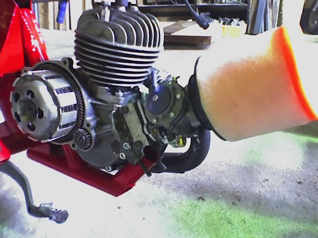 Ratas on enam-vähem valmis. Peal on Emoti viilitud vesijahutusega pütt koos uue spetsiaalselt sellele arvutatud resotoruga. Vahe vana mootoriga on nagu öö ja päev - veab tunduvalt kõrgematel pööretel, kiirendus on super hea (eriti kui toru tööle hakkab, siis läheb nagu väike krossikas), tippkiirus on fantast hea. Mõned vead siiski on, näiteks resotoru kipub väljalaske flantsist välja hüppama (liiga madal flantsi äär). Ajutise lahendusena sai toru külgedele keevitatud plekist ribad, mis ei lase sel külje peale nihkuda. Teiseks tilgub üks radiaatori keevituskoht läbi, sinna määrisin sikaflexi peale, eks näib, kas aitab.