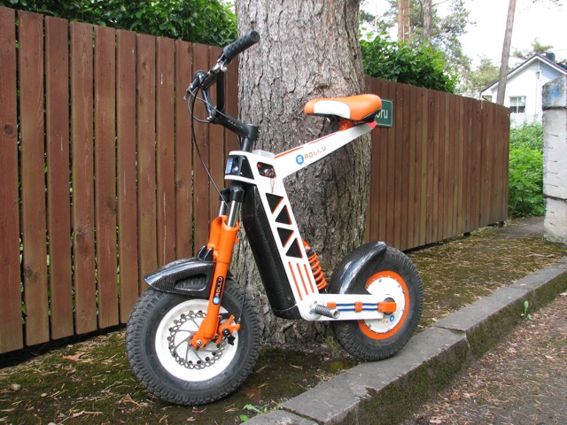 Proovikas. 36v lipo (vedeles laua all) 48v harjadega rummukas ( ilgelt fekaal aga vedeles laua all) kontroller ise tehtud,voolu reguleerimise tulede ja pidurduskontrolliga.Pidur laeb akut. Liigub 20-25kmh läbisõit ca 30km.(oleks õige pingega aku saaks 35 kätte) Raam ja süsinik detailid ise tehtud,jalgratta komponendid sain nõmme rattapoe "prügikastist".Projekt valmis ca 1 kuu.(mai)