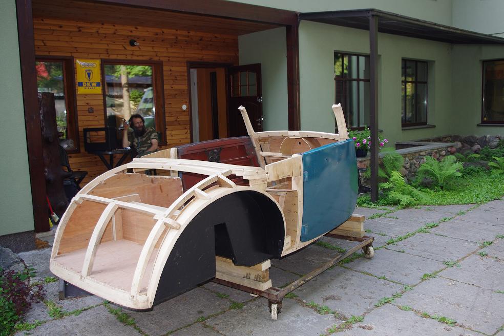 Kahekohalise 1935 aastal valmistatud DKW F5 Front-Luxuse kere puitsõrestik on saanud valmis. Selle valmistamiseks Eestis ma kahjuks võimalusi ei leidnud. Ei leidnud lihtsalt puuseppa, kes oleks selle ette võtnud. Veelgi raskem oli küsimus, kust saada vajalikud mõõdud ja joonised. Asi lahenes Saksamaal Tsehhi piiri lähedal elava Winfried Kuhl´i abil, kes on viimase kahekümne aasta jooksul ehitanud kahekohalise arvu just selle mudeli keresid. Tal on olemas kõigi puitosade originaaldetailid ning sellise arsenali baasil tulevad tal puitsõrestikud päris hästi välja.
