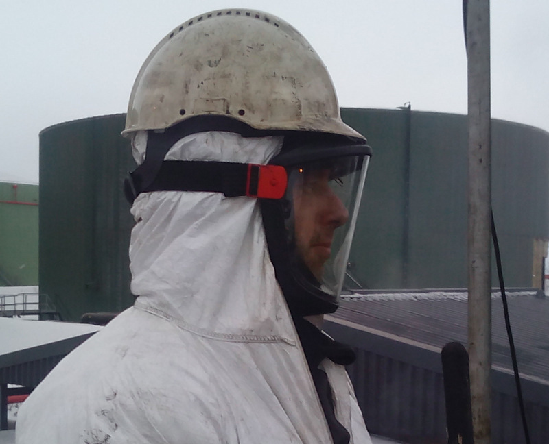 Liivatamise ajal seljas "teletupsu" ülikond (ühekordne kaitseülikond), maskik kasutan vana keevitus maski, millel käib tavaline klaas ette. Hea on ka see "säästumarketi" riidekott aga sellele pole mõistliku hinnaga klaasi saada. Keevitus maskile ka vaja lisada koti taoline ollus ümber, et liiva liialt kraevahele ei jooksek.