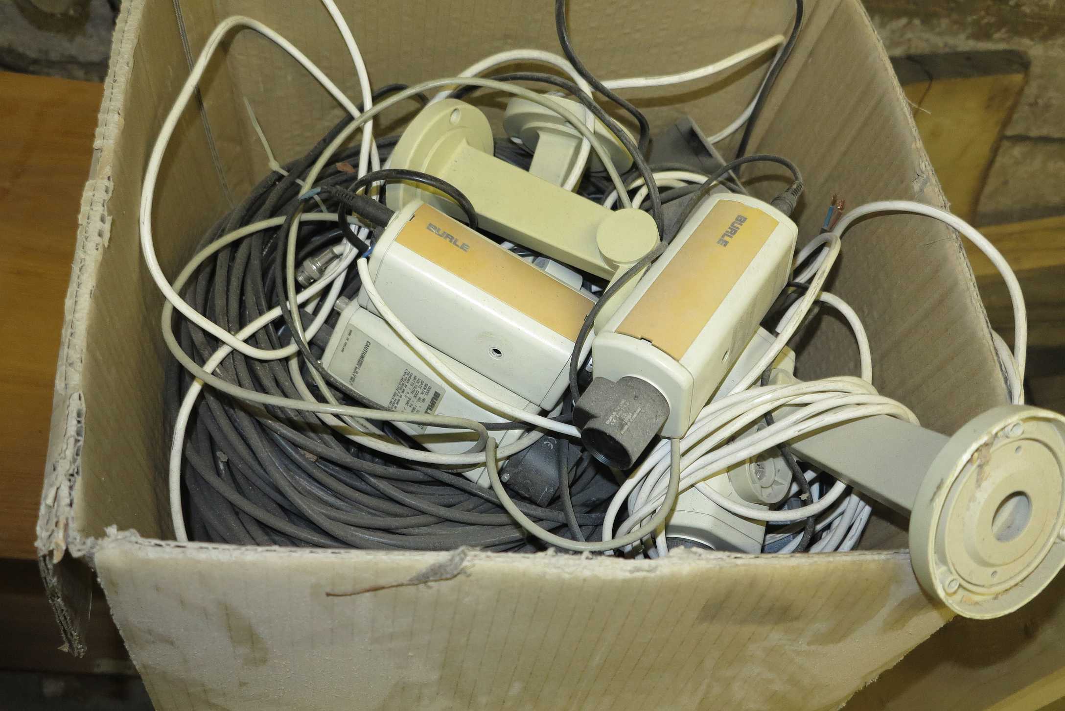 kastitäis valvekaameraid koos kaablite jms-ga, pilti näitav mustvalge kast kah ühes.