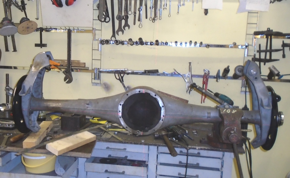 Tagasilla osas oleme teinud jõudsaid edusamme (esisild on suures osas juba eelmisel talvel taastatud). Kasutame hetkel küll veidi aeglasemat Wanderer W23 ülekannet, kuid difri korpus on sama. Tagasilla tala tuli rihtida sirgeks, tasapinnad ajada täisnurka. Riia automuuseumist saime näidiseks sillatala ja rummude vahelised detailid, mis tuli päris uued teha. Vedrukandurid olid keevitatud kõrgemaks, piduriplekid kõverad ning kogu kupatus loomulikult roostest puretud. Kui vedru pealehed kõrvale jätta, siis hakkab sild juba komplektseks saama.