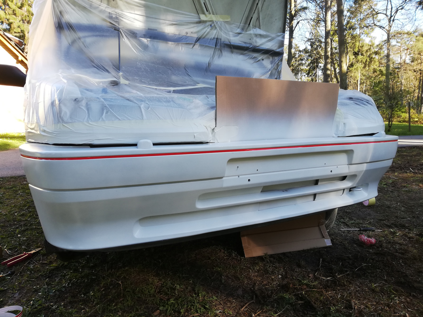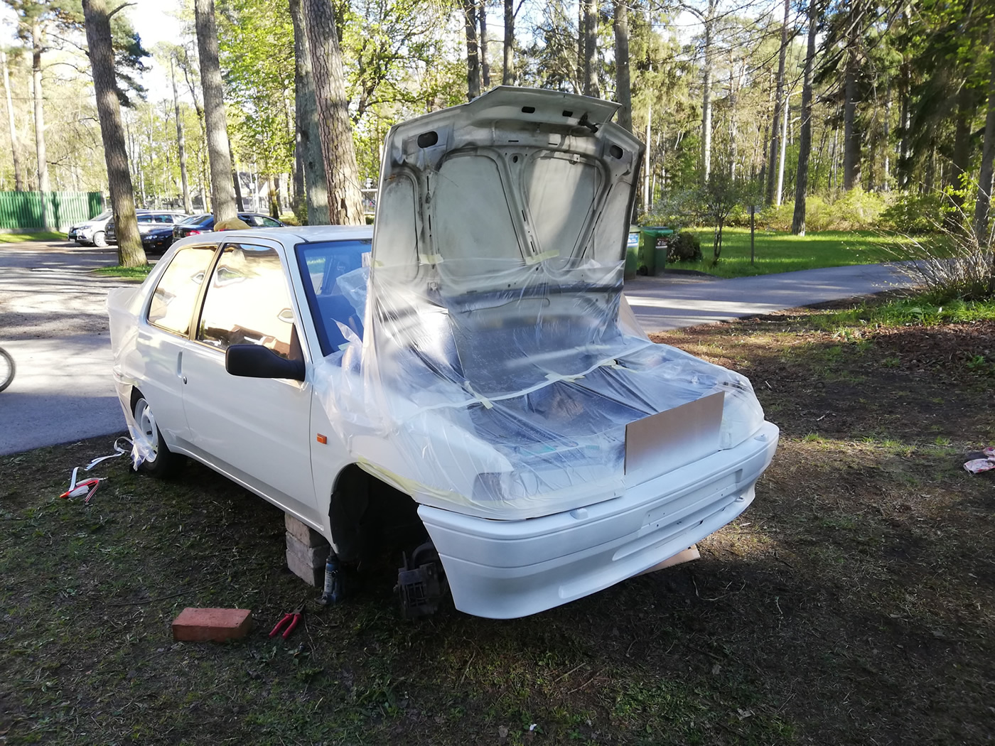 Kuna plaan oli visuaalselt teha auto Peugeot 106 Rallye sarnaseks, siis esimese asjana alustasin stangede ja velgede värvimisest. Võin julgelt öelda, et tehnika pole minu tugevam külg ja nii jäid pidurid ja kinnine tagasild oma aega ootama. Eesmärk ei ole autole üüratuid summasid kulutada ja pigem koduste vahenditega katsetada. Seega käisin ära Motonetis ja tõin mõne purgi kruntvärvi, valget värvi ja lakki. Lisaks mõned rullid maalriteipi ja ühe kattekile. Leidsin Motonetist ka punase kleeppaela, mis sobis hästi stangele ja sai pandud laki alla.
