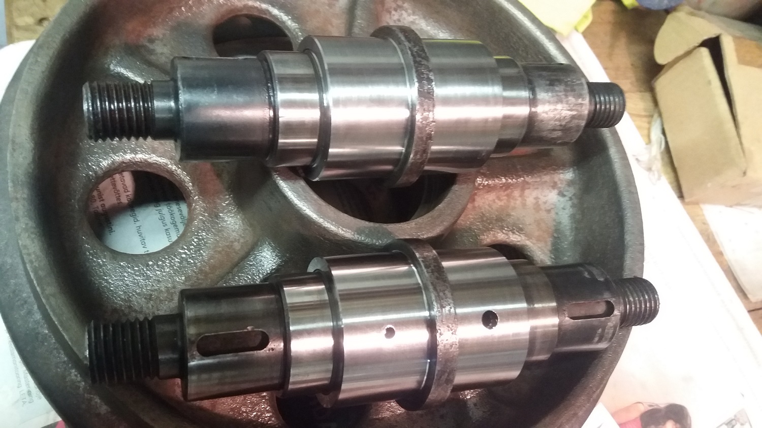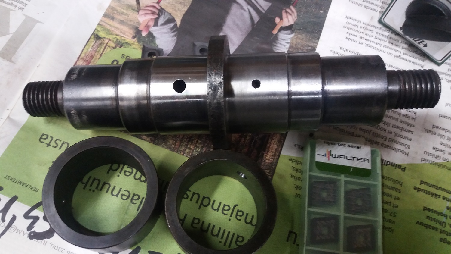 Peategelase juurde tagasi tulles saab öelda, et pöiad on võllidele asetatud. Võllide korda saamiseks tuli kõigepealt korrastada otsad ja tsentriavad. Need tehti ära lüneti abil. Seejärel treiti puksialune pind, mis oli ränk töö kuna liitusid kolm halba asjaolu: löökkoormus, rooste ja pinna suur kõvadus. Roostet eemaldasin omast arust traatharja abil väga hoolega, aga treimisel tuli teda pooridest tera nürimiseks ikka veel piisavalt. Kui oleks kogu töö moodsate terikutega teinud, oleks üpris kalliks maksma läinud, sest plaadike on 5 eur/tk ja neid ikka kulus. Esimeste läbimite juures jagus ühte otsa paariks korraks. Õnneks oli mul olemas sobiva kujuga veneaegseid terikuid ja need sobisid esimeste läbimitega lõhkumiseks väga hästi.