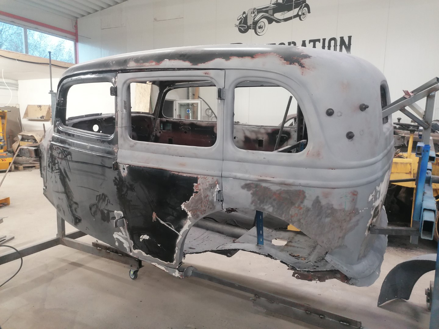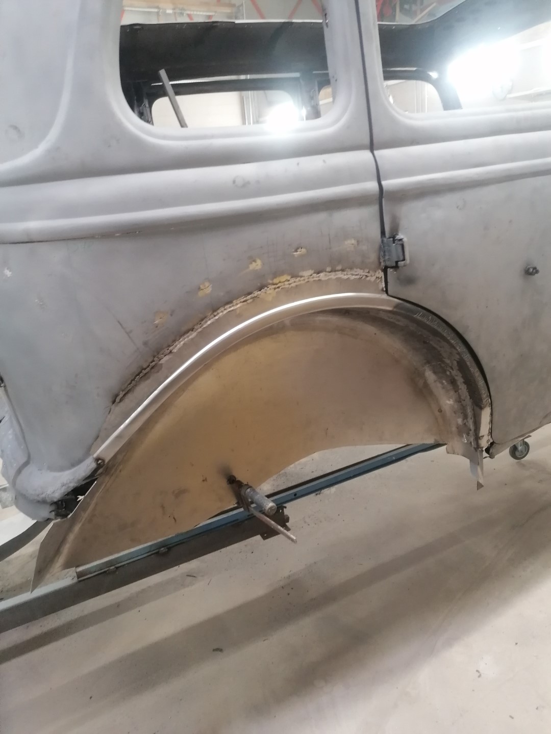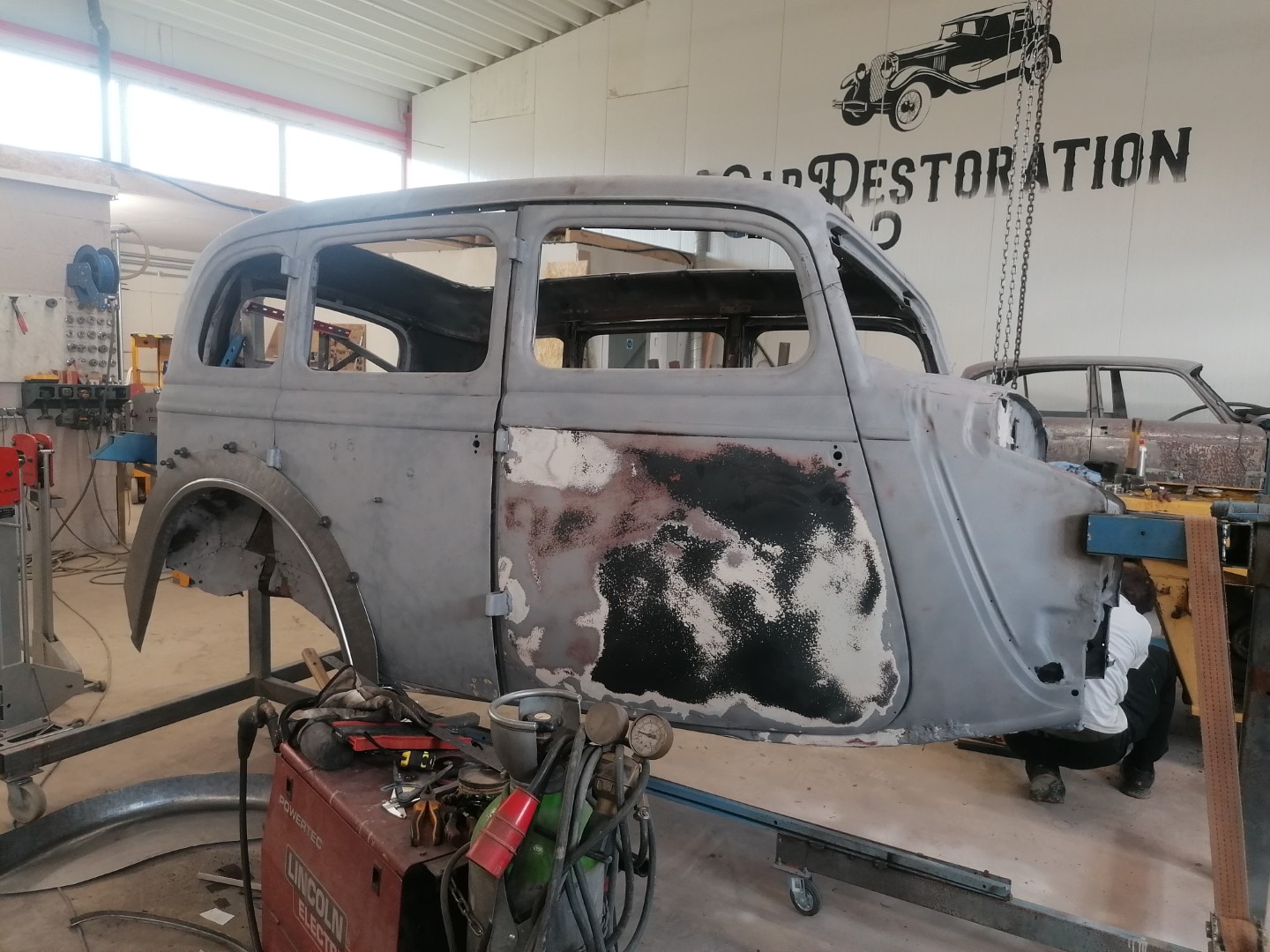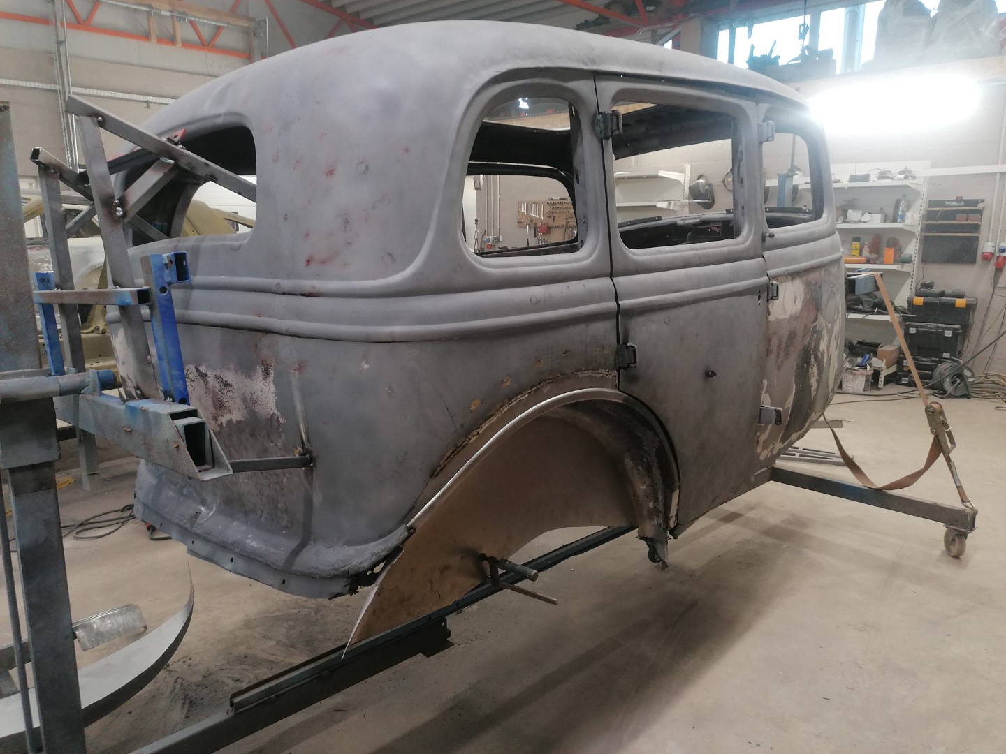 Lõpuks saabus päev, kui tõukasin originaalse M1V8 töösse. Kõigepealt muidugi liivaprits. 80 aastat on muidugi oma jälje jätnud aga auto, mis ostes oli sõidukorras ja pealt küllaltki sile osutus pahtli plönniks. Kohati tuli ikka sm paksusi plönne maha. Present katus oli asendatud plekiga ja imede ime, polnudki keevitatud vaid paarisaja väikse kruviga lihtsalt plaat peale pandud ja siis üle pahteldatud. Alt kõik originaal, kuigi mingit niiskust ikka vahele läinud ja mõned augud sisse roostetanud. Aga mitte midagi hullu. Tagumised sisemised porikoopad suht armetud, vaja uued teha. Põhi 50-50. Kuna kasutusel oli Gaz 24 tagasild, siis oli spetsiaalsed pesad amortide jaoks ehitatud. Kun mul on 3 M1 keret, siis see teeb asja lihtsamaks, sest mõni  detail säilinud ühel, mõni teisel. Eks tuleb selle kerega Replikale järele jõuda, siis saab paralleelselt mõlema projektiga edasi minna. Eks surve ka peal, kuna Replika on tellitud Moskva muuseumisse.  Muidugi mina kutsun teda Replikaks aga tegelikult on ta ikka originaalne M1. Mudel M1V8 on tänapäevane tinglik kasutus aga 30-ndate lõpus oli salastatuse huvides nad kõik M1-d. Ainult mootori vahe + 15 hj, mis tänapäeval ei ole praktiliselt mingi vahe aga tookord küll. Kuna keevitustööd toimuvad Võrus, CarRestaurationis, siis saab paremini tegemistel silma peal hoida ja muidugi ka tihedamini kommenteerida.