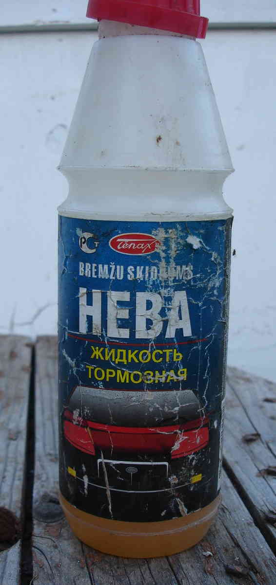 2. Aasta tagasi ostetud DOT4. Taara on tegelikult küll vale, sees on Fixuse vedelik. Lihtsalt väiksema pudeliga oli parem opereerida, valades vedelikku peasilindri anumasse.