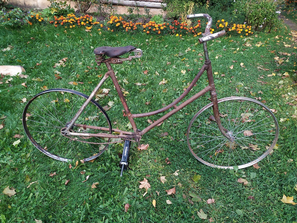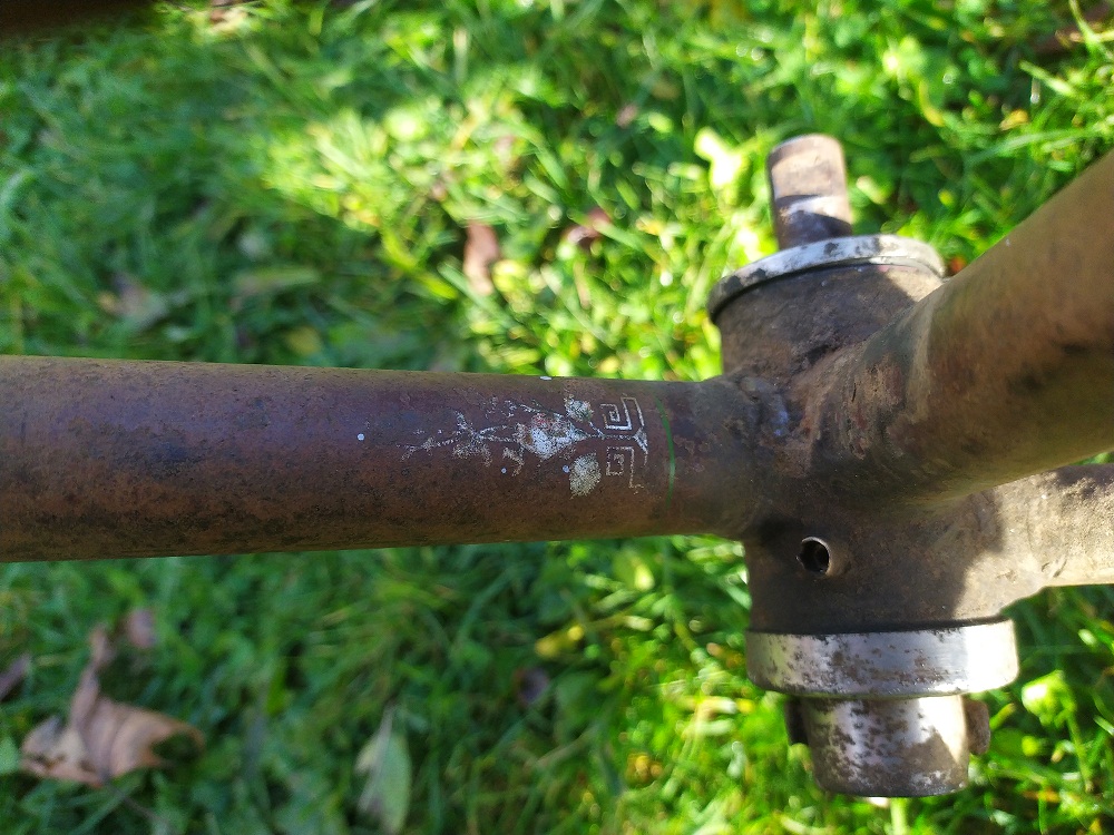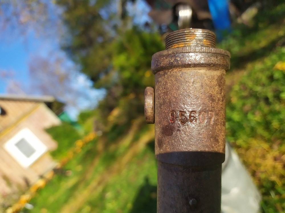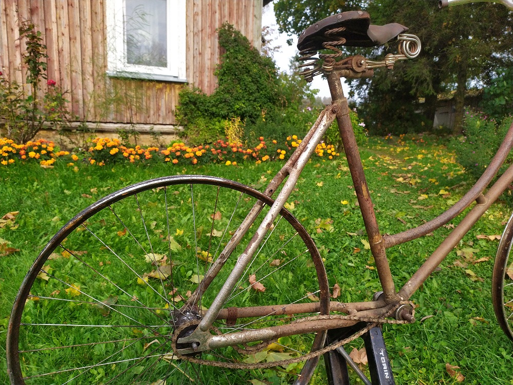Jäi minu ahnete sõrmede vahele üks kaunis lillepostament.  Raaminumber on tal 95607 ja asub see raamikaelal, otse märgi kohal. Märgi aukude vahe on 69mm, märk ise aga kõige kaduva teed läinud. Raami alumise sirge toru peal on veel jupike mingit pilti säilinud. Oli teist juba ka kõvasti vene juppidega järgi aidatud. Küljes olid venelase poritiivad ja all Riga jooksud. Ka sadul tundub teisest muinasjutust. Ketiratas läinud. Kuskilt ühtegi "made in" kirja leida pole suutnud.