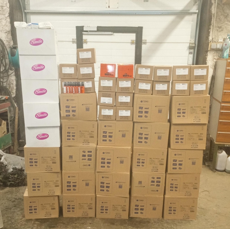 Pakkisime tiba asju, et oleks mugavam Ukrainas asju laiali saata. Kolm suurt kasti lähevad postiga kolme eri kohta. Nendes sisaldub 10 kasti salvrätte ja 14 karpi sääsetõrjet. Väiksem kast on Sorondi varuosad, mis on tihendatud salvrättidega, läheb Volodimirisse koos ülejäänud sääsetõrje ja 16 kasti salvrättidega. Sealt saadetakse edasi. Viimasel pildil nähtava hunniku pappi jätame endale.