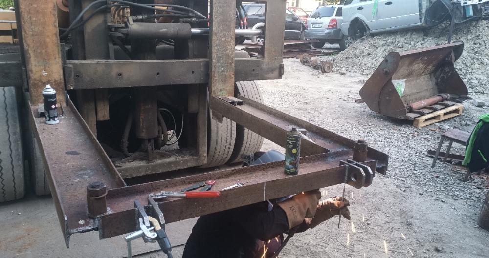 Seda masti metsast välja sikutades otsustas üks masti jupp ootamatult kännu taha takerduda ja minu kolekastika originaal-hiluxi-30-aastat-roostetanud kärukonksu tala murdus. Okei. Käru planeeriti teisele autole sappa ja väljavedu jätkus stange abil mis ettenägelikult tehtud jämedamast materjalist.