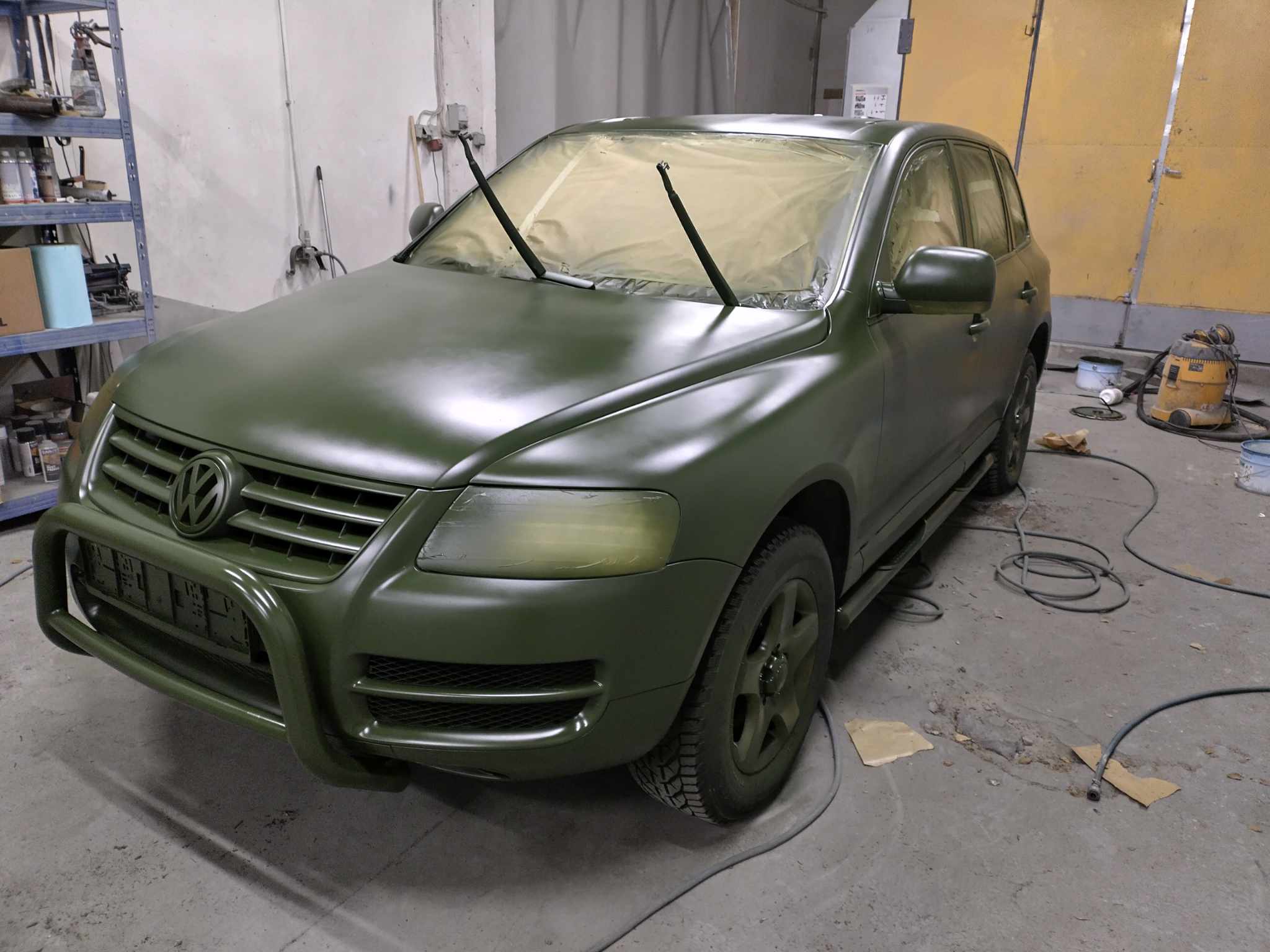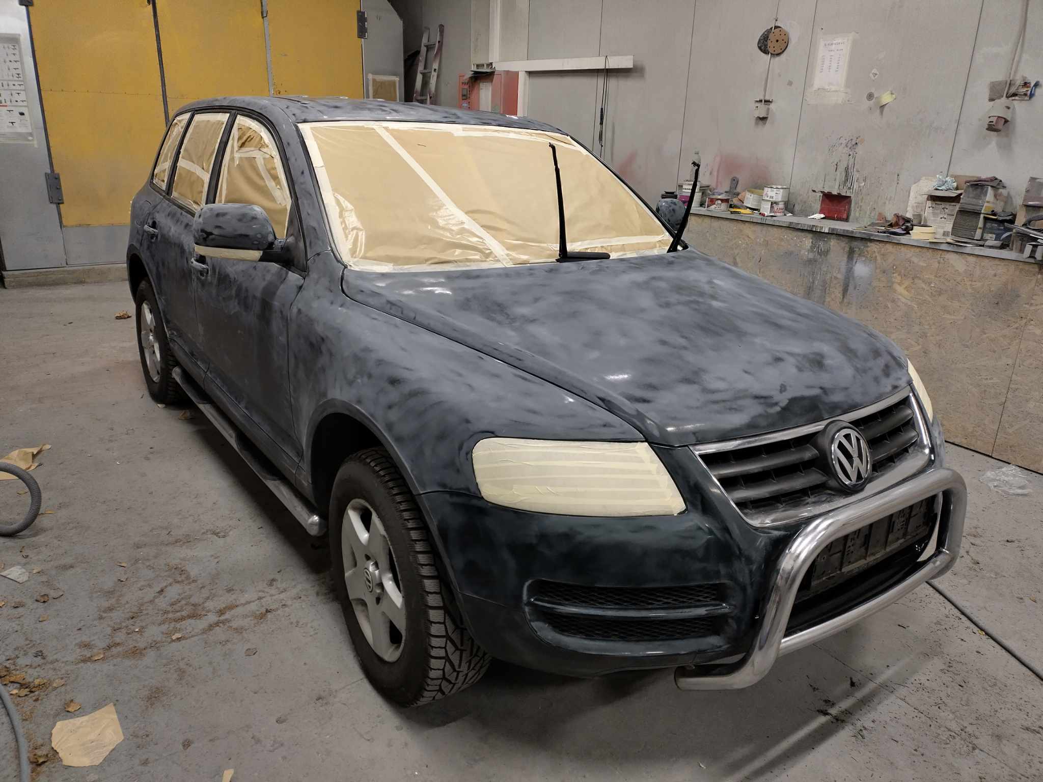 Töö parasjagu käib. Värvimise ajal järgitakse rangeid puhtuse nõudeid - autolt pudenenud essu ja roostet mitte näppida! Las vedeleb töökoja põrandal, kuni auto saab värvitud. Palju lihtsam on koristada, kui autot ees ei ole.