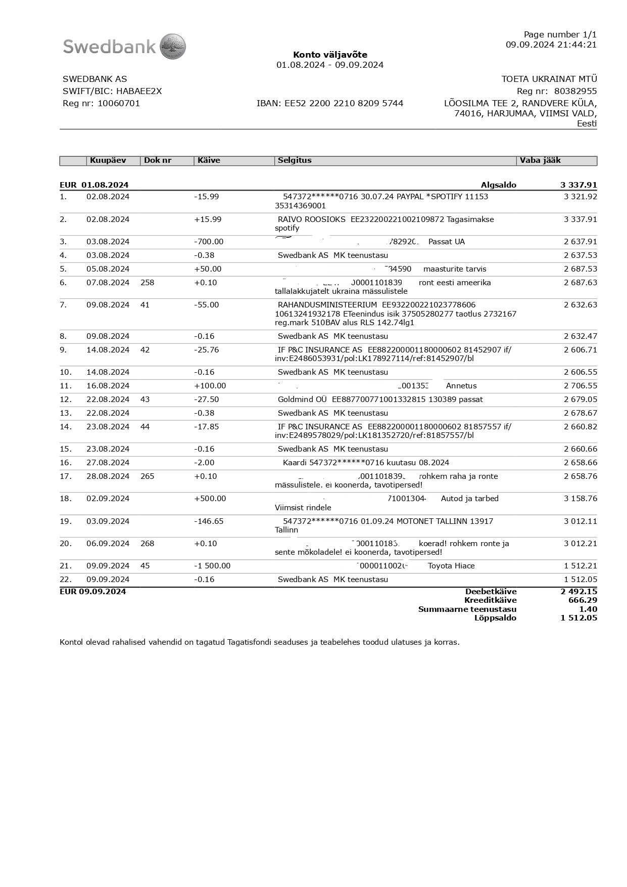 Tänase õhtu saldo meie kontol on 347,17EUR. Töö käib, raha kulub varuosadele, rehvidele ja doonoritele. Teie toetus on väga oluline, et saaksime järgmise plaanitud reisiga autod ja abikoormad Ukrainasse.