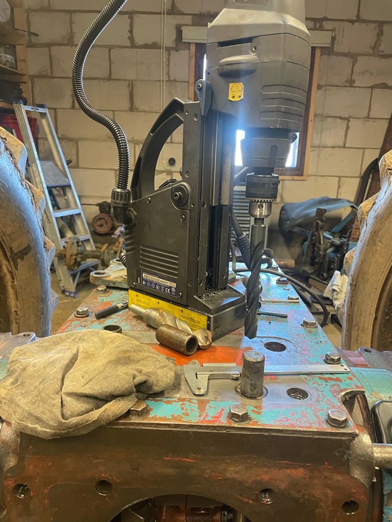 Nädalavhetusel sai omajagu töökojas aega veedetud. Alustatud sai sellest, et puurisin magnetpuuriga tagasilla hüdrosilindri kronsteini avad üle 19,5 puuriga ja keermestasin M22 keermepuuriga ära. Keermestada oli väga hea, kui panin magnetpuurile ühe torni padrunisse ja hoidsin teravikku vastu keermepuuri otsa, sai keerme ilusti otse jooksma panna. Uued keermed on ikka väga ilusad tihedad. Üks torutifti ava on vaja ka suuremaks puurida ja uus tift treida, aga kahjuks polnud kodus sobivat puuri võtta, mis magnetpuuri padrunisse sobib. Proovin järgmine nv uuesti.