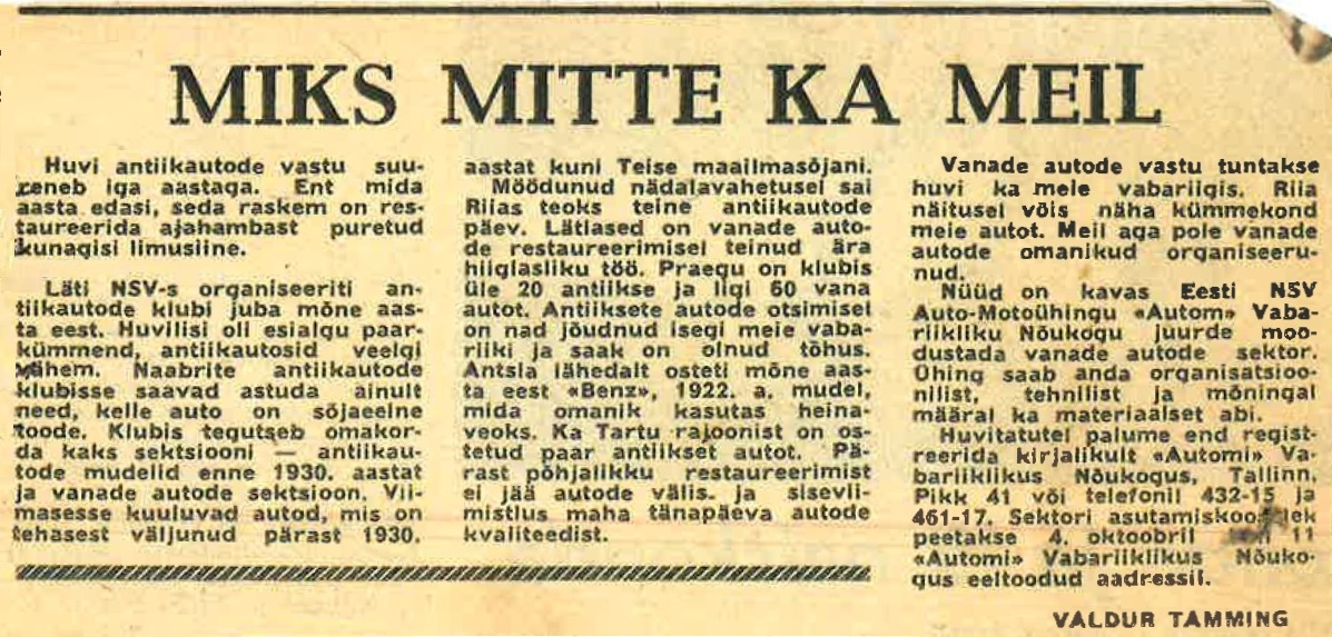 1975 septembrikuus ilmus Automi aseesimees Valdur Tammingu sulest selline teade meie ajakirjanduses.