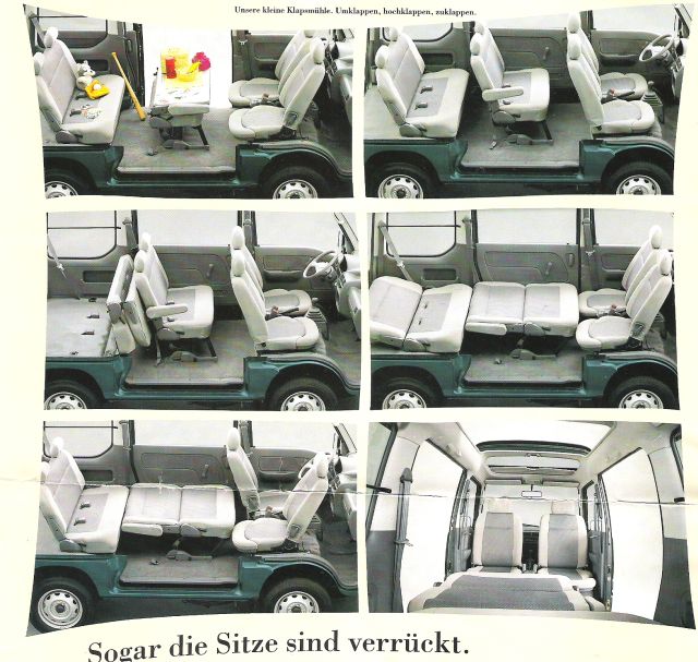nagu näha tegemist väga väikese autoga,kuid seda ei saa öelda salongi kohta.istmetega võimalik teha erinevaid kombinatsioone: