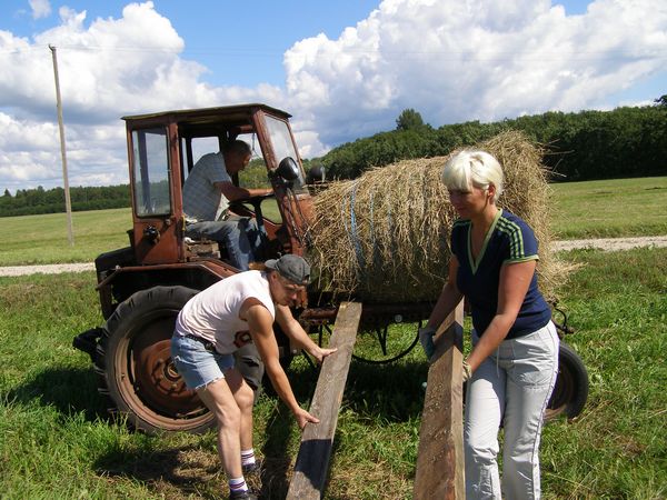 Vedasin ka täna heinu. Tänapäeval siis sedasi. Rull veeretatud planku mööda sassii raamile ja kuuris popsti maha lükat.