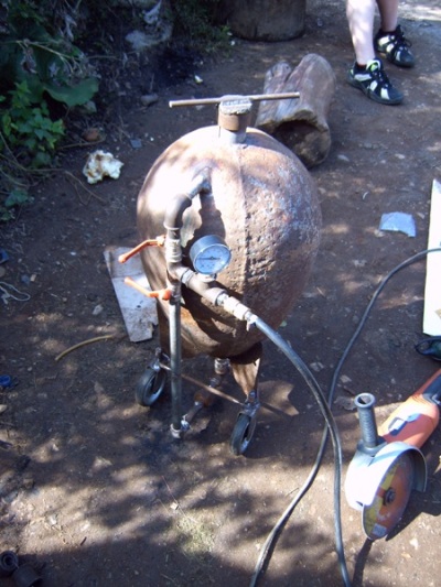 Vahepeal hakkasin liivapritsi ka tegema, et pärast keevitamist raam üle lasta. Siin pildil veel poolik ja lekkete kontrollis: