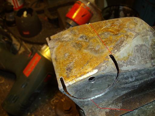 Lõikasin vana stange küljest kaks (kolmas oli mäda) kronsteini ära. Täpselt toru mõõtu freesiga lasin külgstangede sisse toru jaoks augud. Nii sai täpse stange asukoha kätte. Selle järgi töötlesin sama freesiga stange kronsale toru jaoks koha sisse. Rellakaga sirged (punasega märge)väljalõiked ja keevitus.