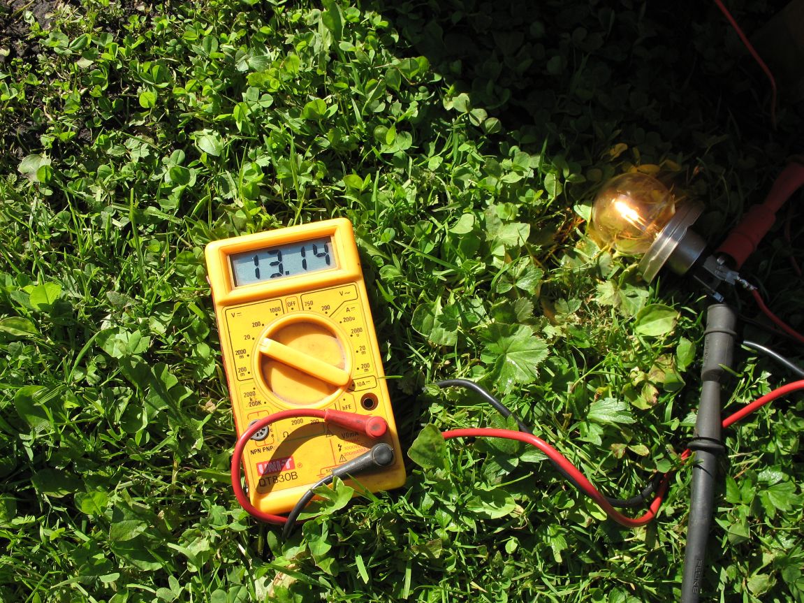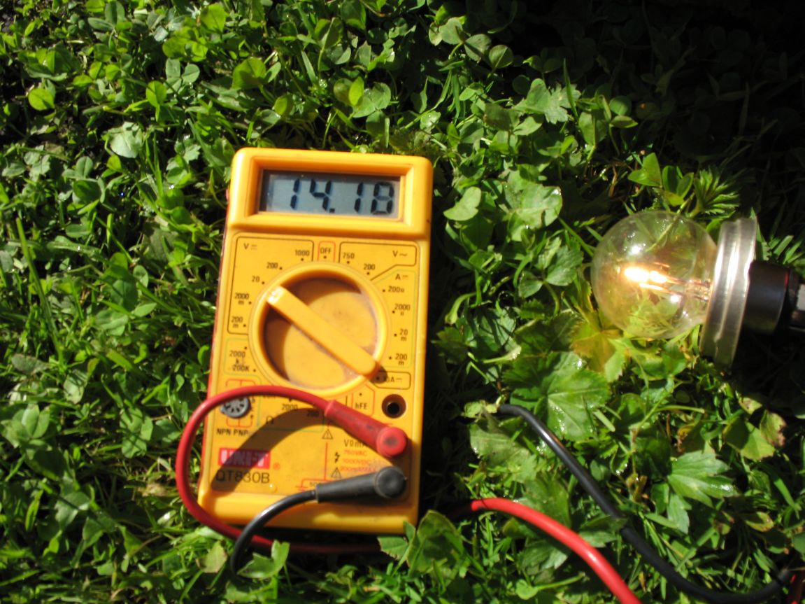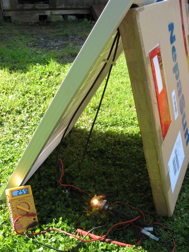 Kuna ilma koormuseta jooksis paneel 25V välja, siis tuli koormuseks midagi tummisemat panna. Veneaegne esilaterna pirn sobis ideaalselt. Paneel on väga suunatundlik. Lapiti maas 1,5A, õige nurga all üle 2,5A!