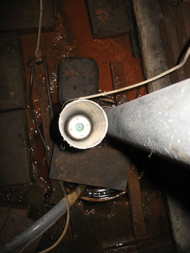 Kole nagu öö, aga töötab! Ujukitoru taga olev samasugune toru käib SOS pumba külge, juhuks kui vett hakkab lahmama nagu Titanicus. Jaanuaris, muide, nii oli. Põranda all tünnis on SOS pumba põhjasõel ja väike K-Rautast ostetud sukelpump, mida siis ujuk normaaloludes opereerib.