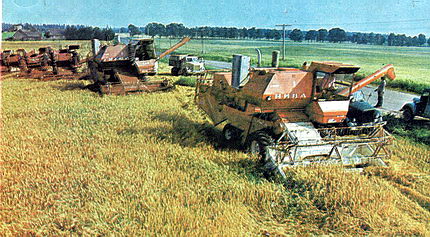 KROSSIFÄNN kirjutas--Kaheksakümnendatel olid kombainid minu lemmikud ja sai alati neid vaatamas ja ka pildistamas käidud.Kuna elukoht sihuke siis oli võimalik natuke jalgrattaga vändates - näha kolme erineva majandi kombaine.Tavaliselt oli lõikusel 5 kuni 10 kombaini.Seda sai jälgitud aastate kaupa.Vanadest pruunidest Nivadest, Kolositest kuni valgekabiinideni välja.------------------------------------------------- E-303 - Kui sa oled vene ajal kombaine vaatamas käinud siis peaks sa mäletama ka NSVL 60 aasta juubeliks ehk 1977 aastal välja lastud niva ja kolos kombaine mis olid värvitud helepunaseks peaaegu oranziks. Rattad ja heeder olid helekollased. Seda oranzi värviga olid ainult 1977 aasta kombainid ja need olid kõige ilusamad .1976 ja 78 aasta masinad olid ka sama värviskeemiga kuid tumedama värvusega.NB.tumedamad 1976 aasta kombainid on kombainitehase pildil. 1979 muutusid kombaini rattad ja haspel helehalliks ning heeder oli taas üleni punane. Kunagi kui tegelesin veel vanaraua kokkuostmisega olen mitmeid nivasid puruks lõiganud ning just meelde on jäänud see ere värv tolle aasta kombainidel mis oli säilinud seal kuhu päike ei pääsenud pleegitama. Alati kui kombaini ära lammutasin jätsin mälestuseks kombaini pirka neid on kogunenud 7-8 tükki enamuses niva omad sain ka pildile.