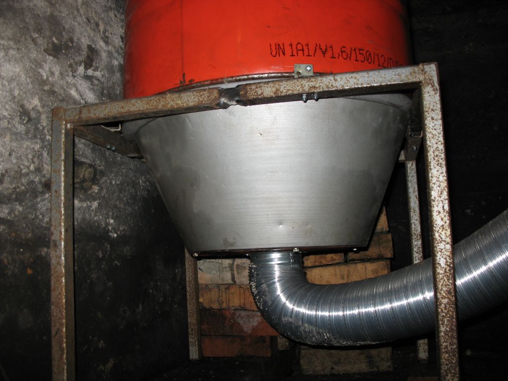 Õhu ringlus on selline, et I korruselt võetakse õhk ja torusse istutatud arvutiventikas surub seda altpoolt soojusvahetisse, kust see suundub edasi puukuivati alumisse otsa. Kuivati tünn on enamvähem hermeetiline. No nii kuidas õnnestus. Ehituse ABC-st avastatud erineva läbimõõduga poroloontihendid on üllatavalt tõhusad. Sealt edasi läheb soe õhk uuesti I korrusele kõrvalruumi, mida mõnedel vabadel hetkedel püüan sisustada tööruumina. Lükkav arvutiventikas käib 24/7, kuna selle voolutarve on väike ja vähesegi päikese olemasolul 12V elekter enivei tasuta. Kütmise ajal käib ka tööruumis olev ja tõmbele töötav 230V 19W vent, mis puhub sooja õhu ruumis hooga laiali. Mõte oli talvel tööruumi (umbes 12m2)soojendada. Üllatuseks annab "Afterburner" rohkem sooja kui oleksin osanud arvatagi. Praeguste ilmadega lööb terve selle majapoole kiiresti soojaks. Alguses oli mure puudest eralduva niiskuse pärast. Esimene ajutine juudiplekist soojusvaheti sai tehtud juba varakevadel ja siis sai ära nähtud, et pole hullu midagi. Märgatavat rõskuse kogunemist ei täheldanud. See julgustas tegema asja kapitaalsemalt. Kui niiskusega peaks siiski probleem tekkima, tuleb teha lõõtstorust lihtne soojusvaheti, mis soojuse tuppa jätab ja maha jahutatud niiske õhk juhtida õue.