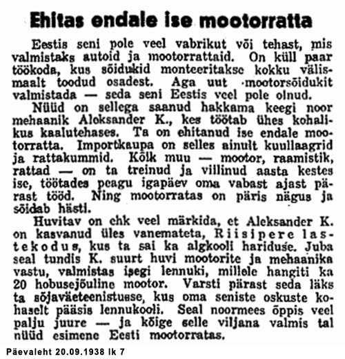 Päevalehes ilmus 20. septembril 1938 selline kirjutis (dea.nlib.ee):