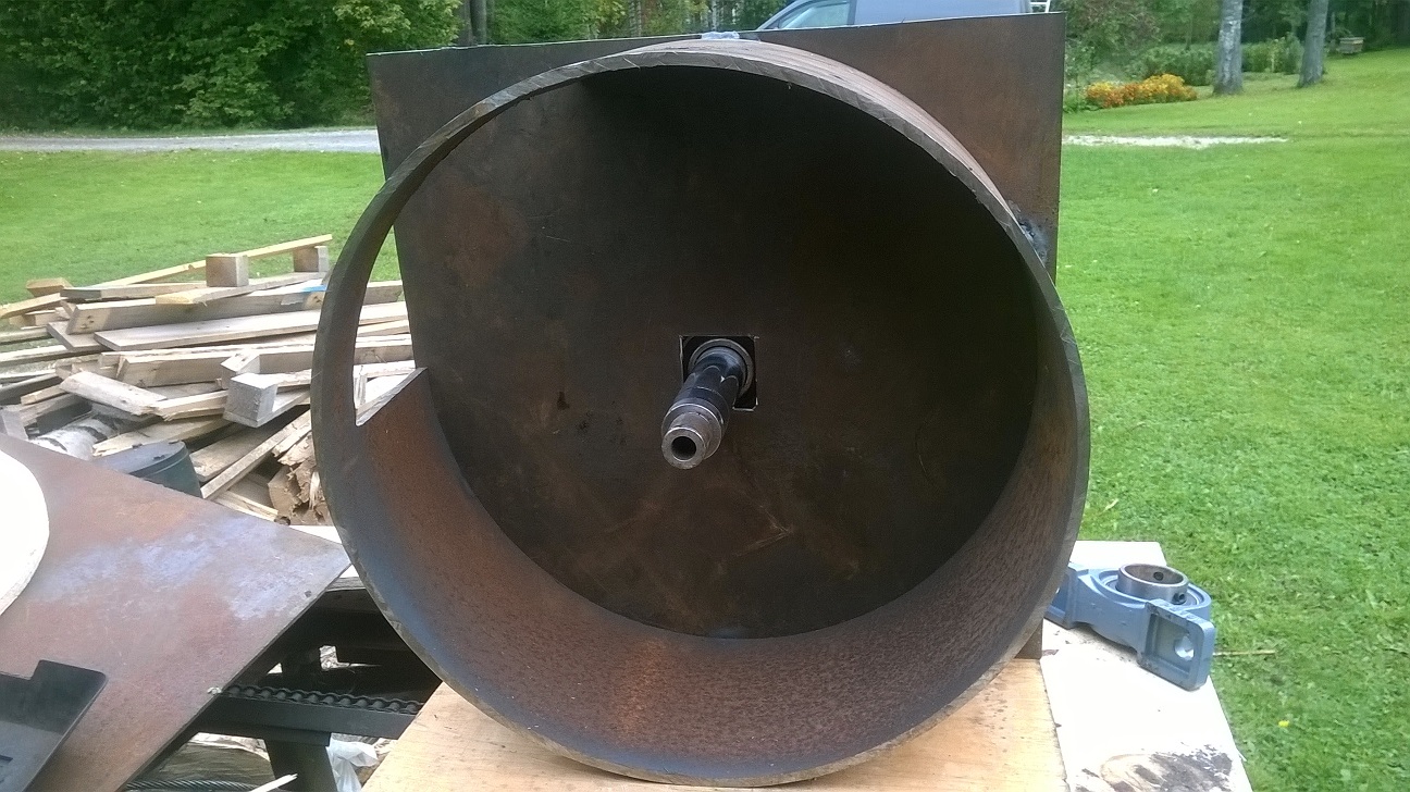 Nojah vana inimese asi kuidas 25 jõuvõtu pööretega nii metsa sai pandud, kust se number meeld jäi no ei tea. Idee oli selles, et kodus kasutan okste ja võsa purustamiseks el. mootori abi, maal kraavipervi puhastades kaabelt ei vea ja eks seega oleks tore kui 25 haakesse saaks krempli sokutada. Vabriku hakkurid mille ketta läbimõõt on 600mm töötavad 540 pöördega, loodan, et minu masin hakkab ka nende pööretega toimima. Igaks juhuks kontrollin veel paar mõtekildu üle: Eeldan, et hakke paksuse määrab tera kõrgus kettast... Oksa ettevedu sõltub oksa ja tera vahelisest nurgast, mida teravam nurk seda parem ettevedu, samas aga suureneb oksa läbilõike pind mis vajab rohkem jõudu. Nädalavahetusel sai natuke korpuse kallal nokitsetud. Alfredo poolt väljapakutud terade sahtlisse paigutamine hakkas mulle meeldima ja ei olegi nii eriline seda teha. Terade paigalhoidmiseks tuleks lihtsalt plaadi tagant poltidega terad vastu sahtli servasi suruda ning asi peaks toimima. Lisan siis lõikeketta joonise mille soovin lasta välja lõigata, palun kriitikat! Kui juba asi metallis siis tiba raske ümber teha, paberi peal veidi lihtsam. Algne plaan nägi ette võllile laagrid ühteotsa aga siis vaatain, et venitan hakkuri ebaloomilikult pikaks ja ketas jääb ka esimesest laagrist juba 150mm kaugusele, hakkab vibrama lõikamise ajal. Nüüd siis mõlema võlli otsa toetus laagripukale. Võlliks kasutan üht vana hüdrosilindri säärt, tea kas muutub hapraks kui ketta sinna peale kinni keevitan? Otsisin siis veidi jõuallika alternatiive kolihunnikust: ZID ühepütane, uus mootor aga käsikäivitus, eriti ei sobi. Lumepuhuri pensamootor 6,5 hp 2000 pööret, jääb lahjaks. Murutraktori mootor 12,6 hp 2000 pööret, pea kõlbaks aga vertikaal võll segab asja ära. Mingi 2 pütane väike jahi diiselmootor, võimsus kahjuks teadmata ja hakka vesijahutust aretama kah liig keeruline. Seega siiski el mootor 5,5 KW 3000 pööret ja T 20 jõuvõlli võimalus. Kas keegi oskab öelda kuidas 20- ne jõuvõlli laagreid vahetatakse, kas ainult ääriku 5 polti lahti ja kogu kupatus tuleb sealt tagant välja või vaja kogu masina tagaosa laiali lammutada?
